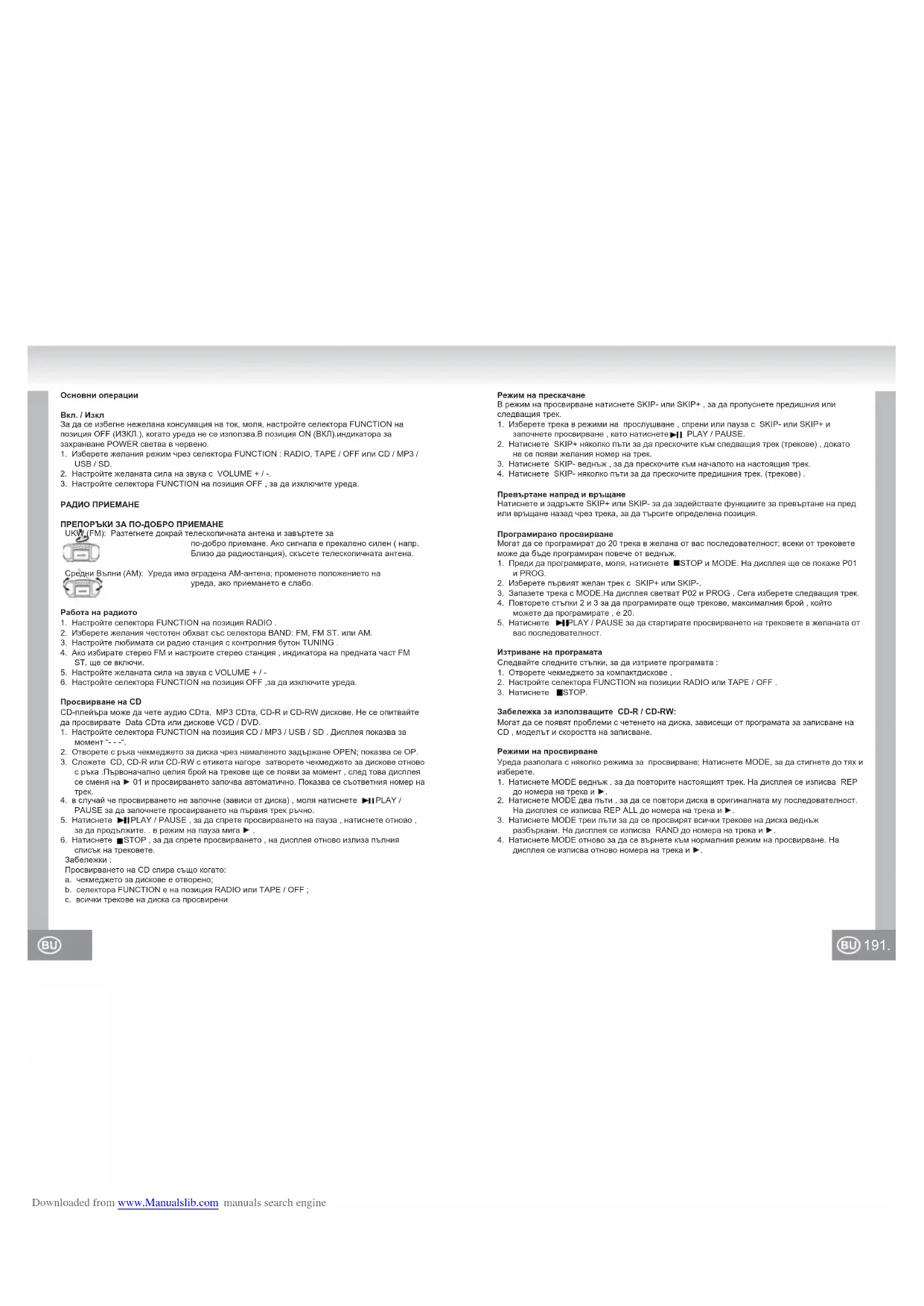 Режим на прескачанеВ режим на просвирване натиснете SKIP- или SKIP+ , за да пропуснете предишния или следващия трек.1. Изберете трека в режими на прослушване , спрени или пауза с SKIP- или SKIP+ и започнете просвирване , като натиснете PLAY / PAUSE.2. Натиснете SKIP+ няколко пъти за да прескочите към следващия трек (трекове) , докато не се появи желания номер на трек. 3. Натиснете SKIP- веднъж , за да прескочите към началото на настоящия трек. 4. Натиснете SKIP- няколко пъти за да прескочите предишния трек. (трекове) .Превъртане напред и връщанеНатиснете и задръжте SKIP+ или SKIP- за да задействате функциите за превъртане на пред или връщане назад чрез трека, за да търсите определена позиция.Програмирано просвирванеМогат да се програмират до 20 трека в желана от вас последователност; всеки от трековете може да бъде програмиран повече от веднъж.1. Преди да програмирате, моля, натиснете STOP и MODE. На дисплея ще се покаже P01 и PROG.2. Изберете първият желан трек с SKIP+ или SKIP-.3. Запазете трека с MODE.На дисплея светват P02 и PROG . Сега изберете следващия трек.4. Повторете стъпки 2 и 3 за да програмирате още трекове, максималния брой , който можете да програмирате , е 20.5. Натиснете PLAY / PAUSE за да стартирате просвирването на трековете в желаната от вас последователност.Изтриване на програматаСледвайте следните стъпки, за да изтриете програмата :1. Отворете чекмеджето за компактдискове .2. Настройте селектора FUNCTION на позиции RADIO или TAPE / OFF .3. Натиснете STOP.Забележка за използващите CD-R / CD-RW:Могат да се появят проблеми с четенето на диска, зависещи от програмата за записване на CD , моделът и скоростта на записване.Режими на просвирванеУреда разполага с няколко режима за просвирване; Натиснете MODE, за да стигнете до тях и изберете.1. Натиснете MODE веднъж , за да повторите настоящият трек. На дисплея се изписва REP до номера на трека и ►.2. Натиснете MODE два пъти , за да се повтори диска в оригиналната му последователност. На дисплея се изписва REP ALL до номера на трека и ►.3. Натиснете MODE треи пъти за да се просвирят всички трекове на диска веднъж разбъркани. На дисплея се изписва RAND до номера на трека и ►.4. Натиснете MODE отново за да се върнете към нормалния режим на просвирване. На дисплея се изписва отново номера на трека и ►. Downloaded from www.Manualslib.com manuals search engine193. 192. Просвирване на дискове MP31. Настройте селектора FUNCTION на позиция CD / MP3 / USB / SD .На дисплея се изписва “- - -“ за момент .2. отворете чекмеджето за компактдискове с ръка с намалено задържане OPEN; показва се OP. 3. Сложете диск с MP3 с етикета нагоре и затворете с ръка чекмеджето за дискове. На дисплея се изписва MP3, ► и 001 и просвирването започва автоматично. На дисплея се показва съответния номер на трек. 4. В случай , че просвирването не започне (зависи от диска) , моля, натиснете PLAY / PAUSE , за да стартирате просвирването на първия трек ръчно. 5. Натиснете PLAY / PAUSE за да спрете просвирването на пауза ; натиснете отново , за да продължите просвурването . В режим на пауза мига ► .6. Натиснете STOP за да спрете просвирването; на дисплея отново се изписва общия брой трекове. Забележка : Просвирването на дискове с MP3 CD спира същи така, когато : a. чекмеджето за дискове е отворено; b. селектора FUNCTION е плъзнат на позиции RADIO или TAPE / OFF c. всички трекове от MP3 диска са просвирени.Режим на прескачанеВ режим на просвирване натиснете SKIP- или SKIP+ , за да пропуснете предишния или следващия трек1. Изберете тр