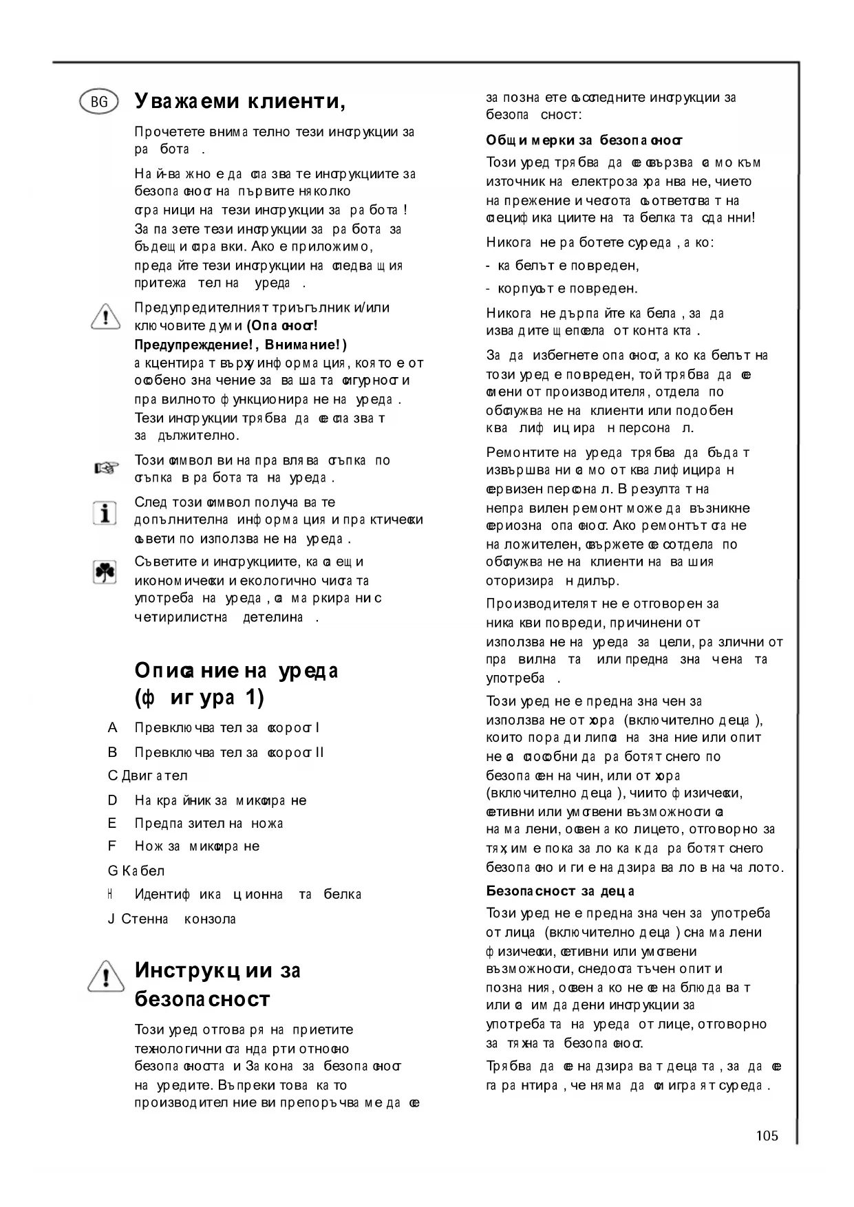 На й-ва жно е да спа зва те инструкциите за безопа сност на първите ня колко страници на тези инструкции за ра бота ! За па зете тези инструкции за ра бота за бъдещ и спра вки. Ако е приложимо, преда йте тези инструкции на следващ ия притежа тел на уреда . Предупредителният триъгълник и/или клю човите думи (Опасност! Предупреждение!, Внимание!) а кцентира т върху инф орма ция , коя то е от особено зна чение за ва ша та сигурност и пра вилното ф ункционира не на уреда . Тези инструкции тря бва да се спа зват за дължително. Този символ ви на пра вля ва стъпка по стъпка в ра ботата на уреда . След този символ получа ва те допълнителна инф орма ция и пра ктически съвети по използва не на уреда . Съветите и инструкциите, ка са ещ и икономически и екологично чистата употреба на уреда , са м а ркира ни с четирилистна детелина . Описание на уреда (ф игура 1) A Превклю чва тел за скорост I B Превклю чва тел за скорост II C Двигател D На кра йник за м иксира не E Предпа зител на ножа F Нож за миксира не G Кабел H Идентиф ика ционна та белка J Стенна конзола Инструкции за безопасност Този уред отгова ря на приетите технологични ста нда рти относно безопа сността и За кона за безопа сност на уредите. Въпреки това ка то производител ние ви препоръчва ме да се за позна ете със следните инструкции за безопа сност: Общ и мерки за безопасност