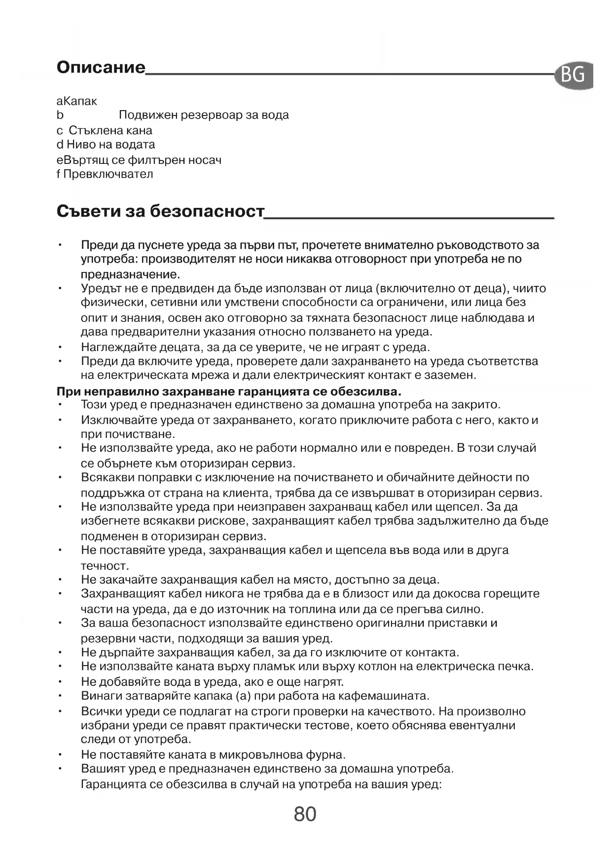 b Пижен езе‚о‡ з‡ ‚ c Стъклен‡ к‡н‡ d Ни‚о н‡ ‚т‡ е Вътflщ се филтъен нос‡ч f Пе‚ключ‚‡тел Съ‚ети з‡ безоп‡сност