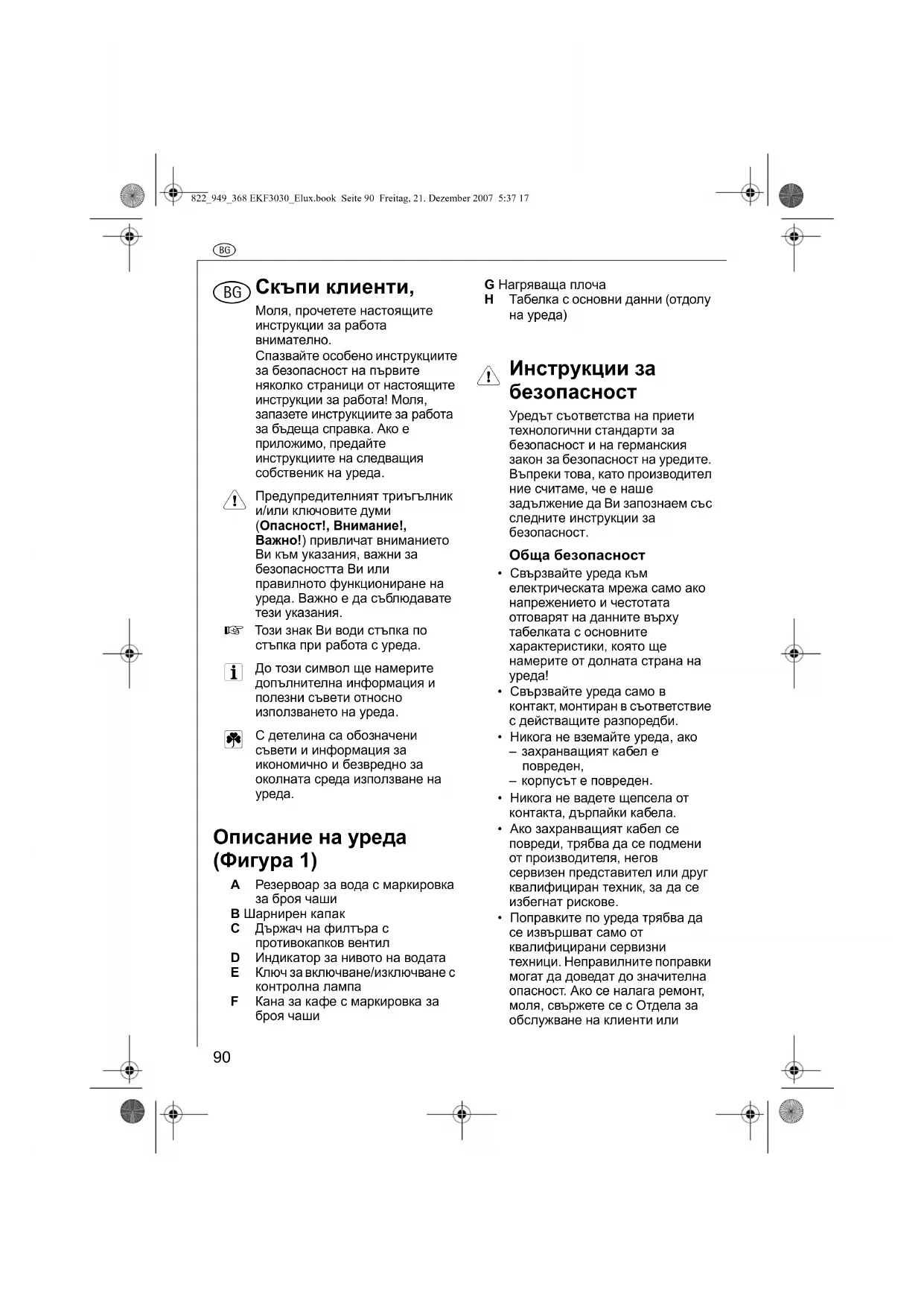 С детелина са обозначени съвети и информация за икономично и безвредно за околната среда използване на Описание на уреда (Фигура 1) A Резервоар за вода с маркировка за броя чаши B Шарнирен капак C Държач на филтъра с противокапков вентил D Индикатор за нивото на водата E Ключ за включване/изключване с контролна лампа F Кана за кафе с маркировка за броя чашиG Нагряваща плоча Н Табелка с основни данни (отдолу