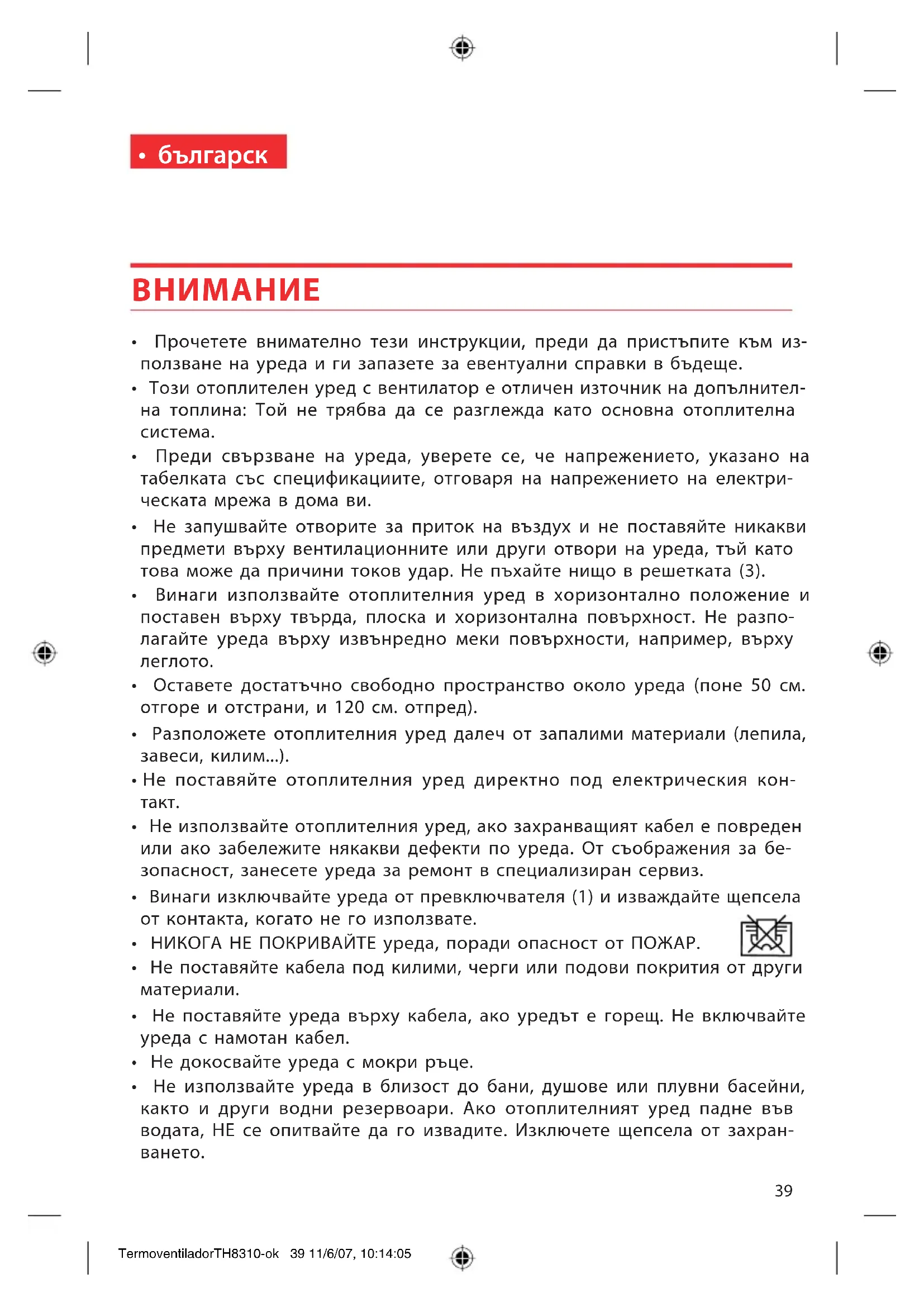 - Когато в стаята бъде достигната желаната температура, бавно завъртете регулатора за температурата (2) по посока на часовниковата стрелка, докато се чуе леко щракване. Отоплителният уред с вентилатор ще се изключи. Уредът ще се включва и изключва, за да поддържа избраната температура в стаята. TermoventiladorTH8310-ok 40 11/6/07, 10:14:1041
