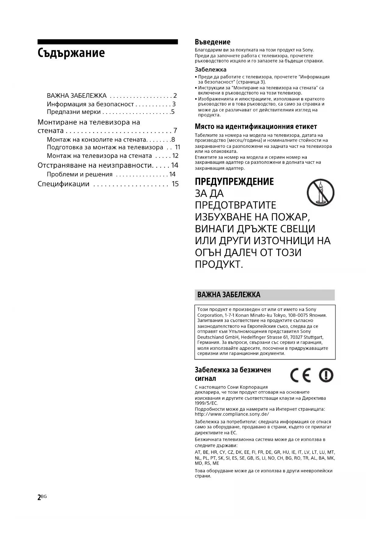 Благодарим ви за покупката на този продукт на Sony.Преди да започнете работа с телевизора, прочетете ръководството изцяло и го запазете за бъдещи справки.Забележка• Преди да работите с телевизора, прочетете “Информация за безопасност” (страница 3).• Инструкции за “Монтиране на телевизора на стената” са включени в ръководството на този телевизор. • Изображенията и илюстрациите, използвани в краткото ръководство и в това ръководство, са само за справка и може да се различават от действителния изглед на продукта. Място на идентификационния етикет Табелките за номера на модела на телевизора, датата на производство (месец/година) и номиналните стойности на захранването са разположени на задната част на телевизора или на опаковката. Етикетите за номер на модела и сериен номер на захранващия адаптер са разположени в долната част на захранващия адаптер. ПРЕДУПРЕЖДЕНИЕ