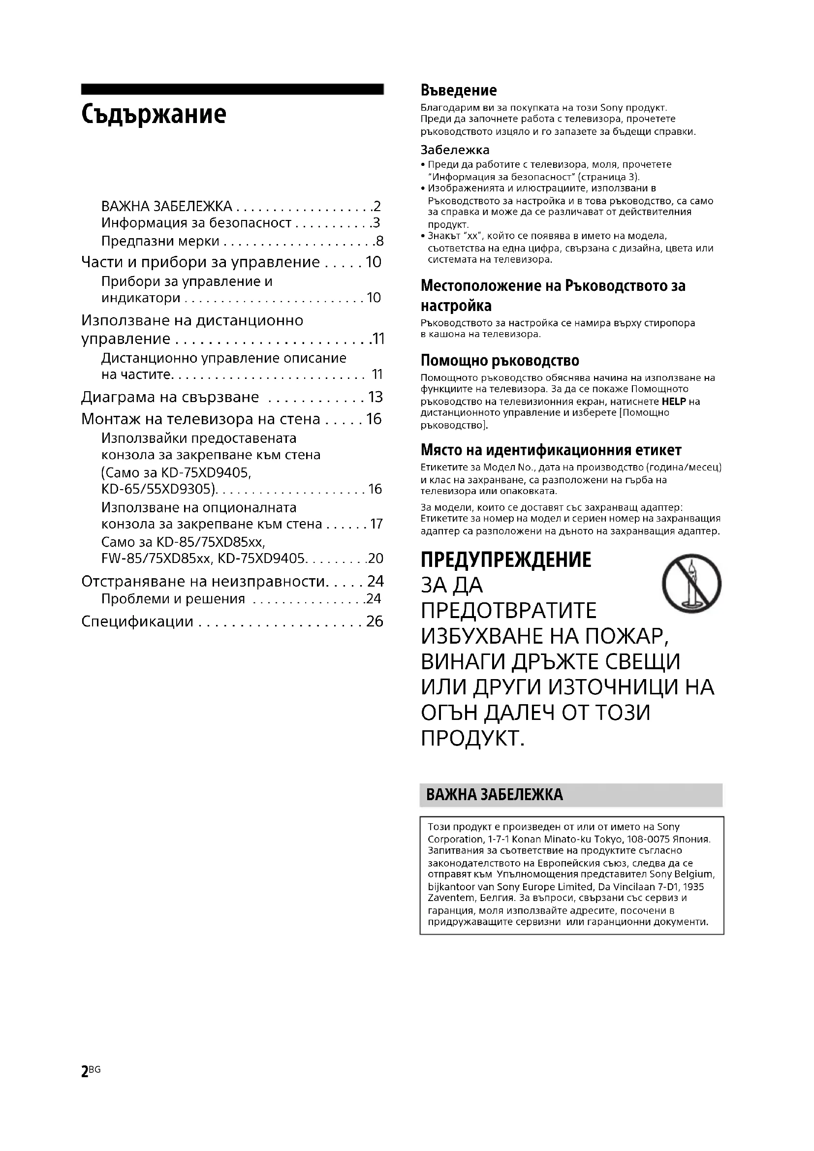 Благодарим ви за покупката на този Sony продукт.Преди да започнете работа с телевизора, прочетете ръководството изцяло и го запазете за бъдещи справки.Забележка• Преди да работите с телевизора, моля, прочетете “Информация за безопасност” (страница 3).• Изображенията и илюстрациите, използвани в Ръководството за настройка и в това ръководство, са само за справка и може да се различават от действителния продукт.• Знакът “xx”, който се появява в името на модела, съответства на една цифра, свързана с дизайнa, цвета или системата на телевизора. Местоположение на Ръководството за