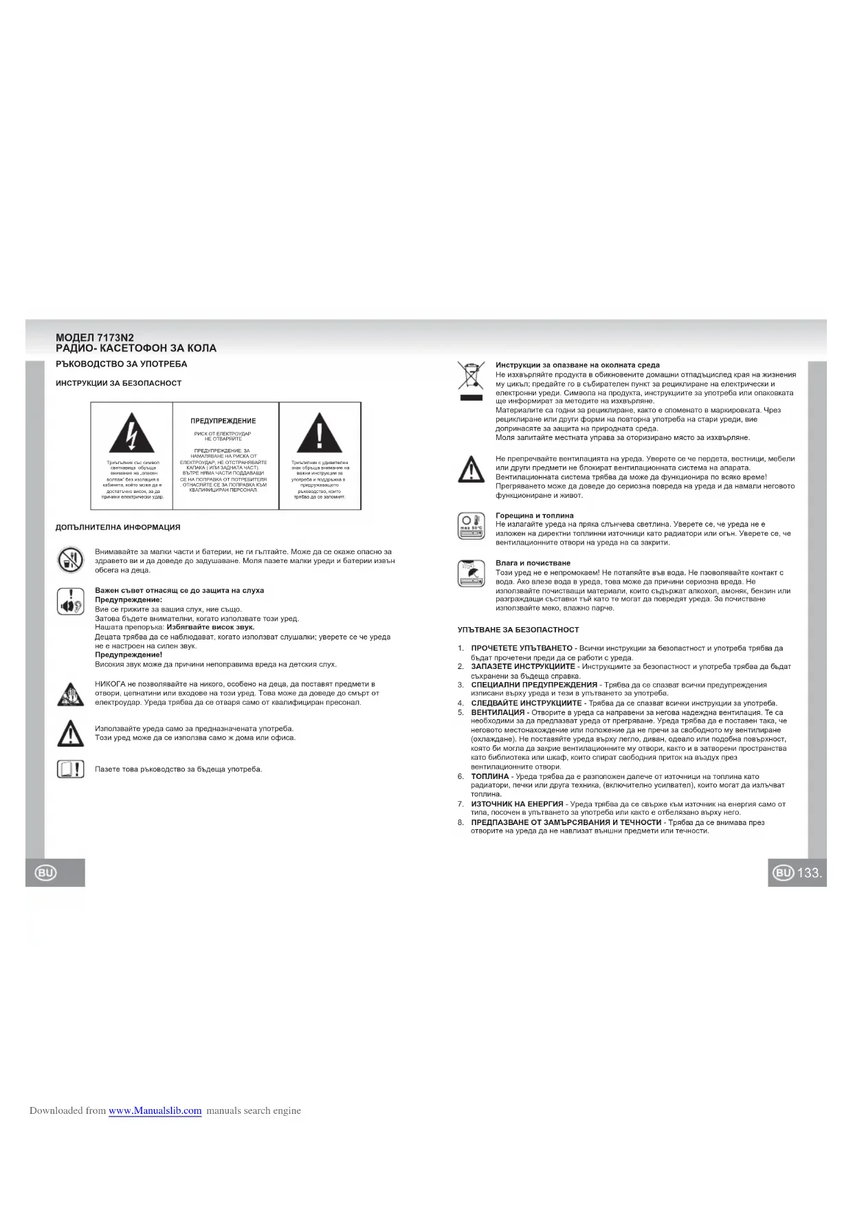 отворите на уреда да не навлизат външни предмети или течности.Не препречвайте вентилацията на уреда. Уверете се че пердета, вестници, мебели или други предмети не блокират вентилационната система на апарата. Вентилационната система трябва да може да функционира по всяко време! Прегряването може да доведе до сериозна повреда на уреда и да намали неговото функциониране и живот.Горещина и топлинаНе излагайте уреда на пряка слънчева светлина. Уверете се, че уреда не е изложен на директни топлинни източници като радиатори или огън. Уверете се, че вентилационните отвори на уреда на са закрити.Влага и почистванеТози уред не е непромокаем! Не потапяйте във вода. Не пзоволявайте контакт с вода. Ако влезе вода в уреда, това може да причини сериозна вреда. Не използвайте почистващи материали, които съдържат алкохол, амоняк, бензин или разграждащи съставки тъй като те могат да повредят уреда. За почистване използвайте меко, влажно парче.Инструкции за опазване на околната средаНе изхвърляйте продукта в обикновените домашни отпадъцислед края на жизнения му цикъл; предайте го в събирателен пункт за рециклиране на електрически и електронни уреди. Символа на продукта, инструкциите за употреба или опаковката ще информират за методите на изхвърляне.Материалите са годни за рециклиране, както е споменато в маркировката. Чрез рециклиране или други форми на повторна употреба на стари уреди, вие допринасяте за защита на природната среда.Моля запитайте местната управа за оторизирано място за изхвърляне. Downloaded from www.Manualslib.com manuals search engine135. 134.