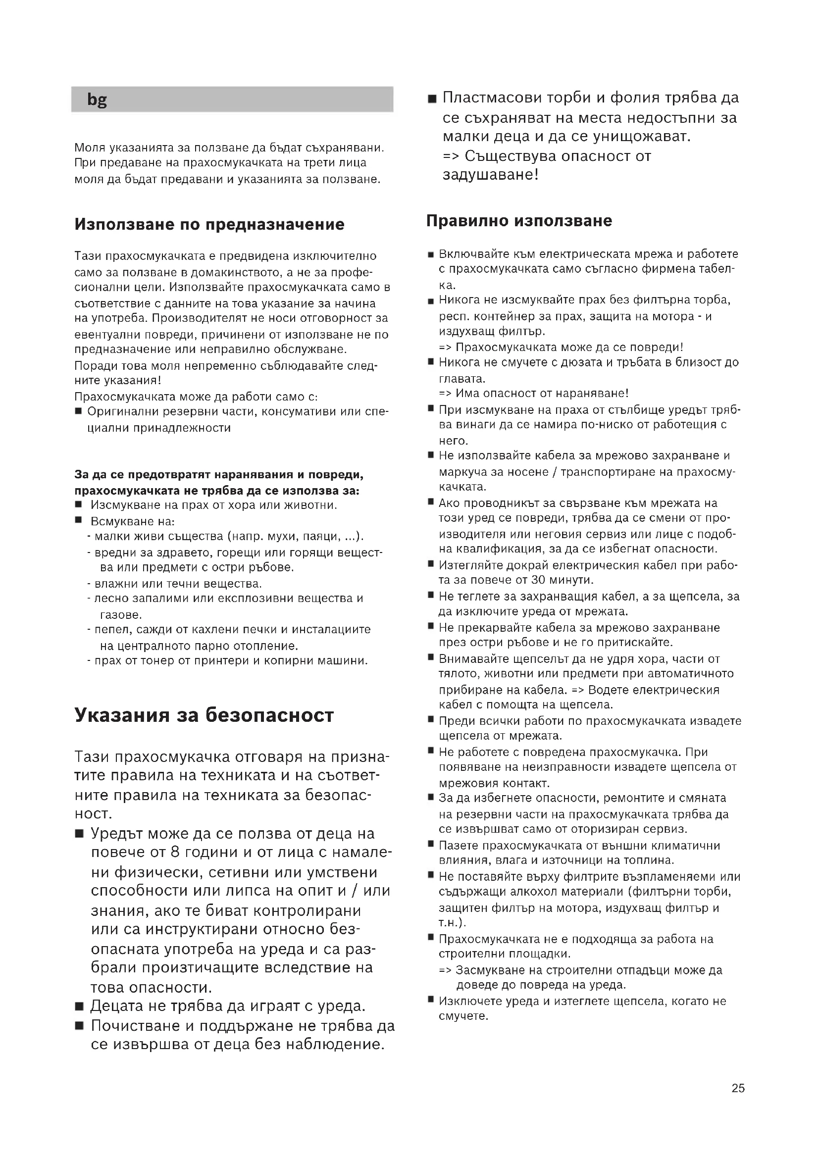 амо за ползване в домакинството, а не за профе- сионални цели. Използвайте прахосмукачката само в съответствие с данните на това указание за начина на употреба. Производителят не носи отговорност за евентуални повреди, причинени от използване не по предназначение или неправилно обслужване. Поради това моля непременно съблюдавайте след- ните указания! Прахосмукачката може да работи само с: Оригинални резервни чaсти, консумативи или спе- циални принадлежности За да се предотвратят наранявания и повреди, прахосмукачката не трябва да се използва за: Изсмукване на прах от хора или животни. Всмукване на: - малки живи същества (напр. мухи, паяци, ...). - вредни за здравето, горещи или горящи вещест- ва или предмети с остри ръбове. - влажни или течни вещества. - лесно запалими или експлозивни вещества и
