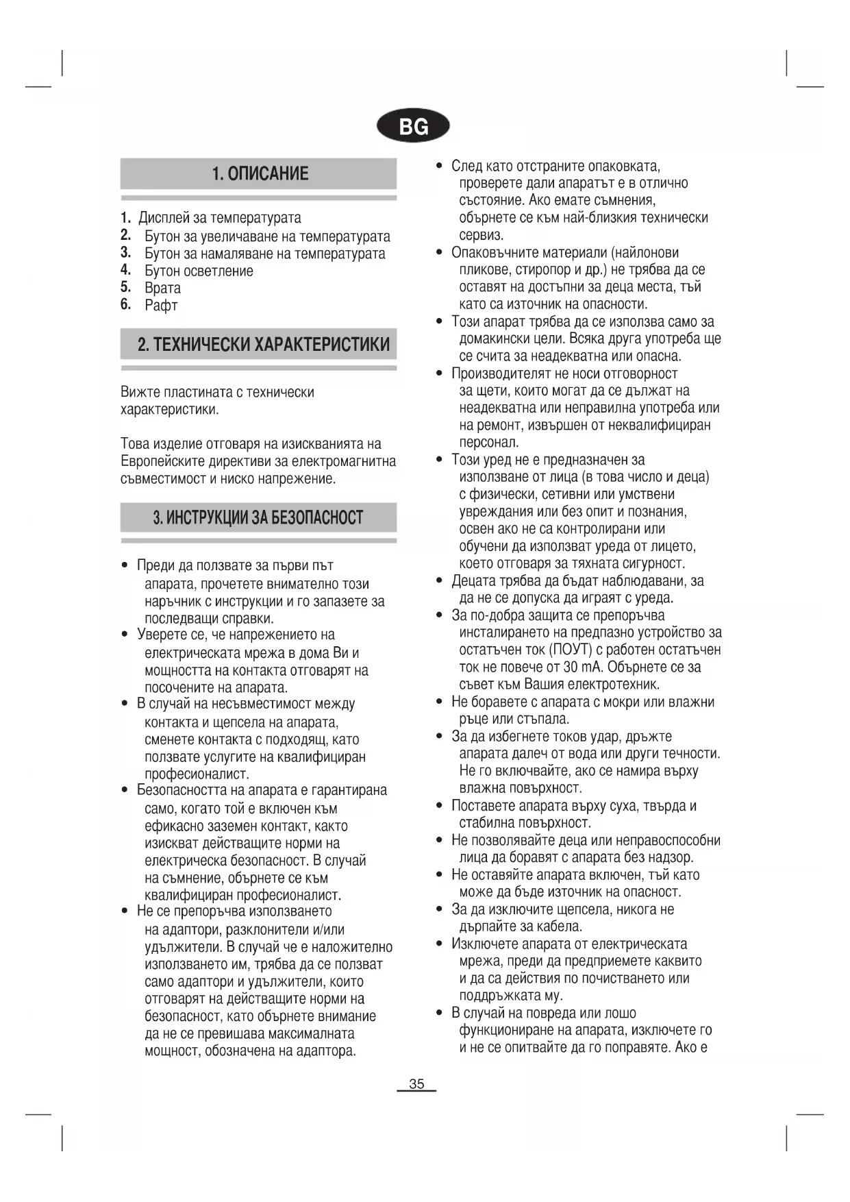 - Безопасността на апарата е гарантирана само, когато той е включен към ефикасно заземен контакт, както изискват действащите норми на електрическа безопасност. В случай на съмнение, обърнете се към квалифициран професионалист.