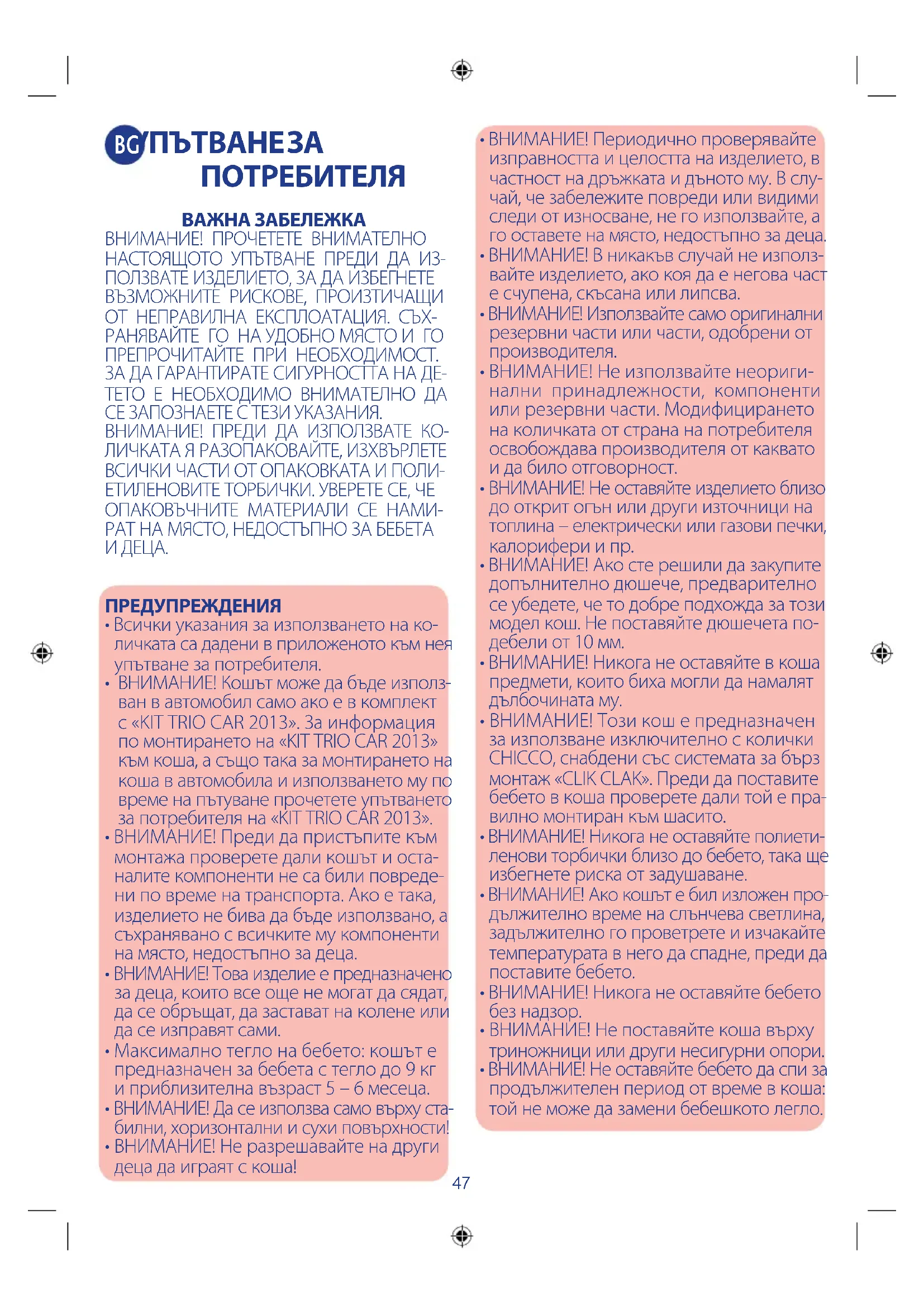 - ВНИМАНИЕ! Кошът може да бъде използ- ван в автомобил само ако е в комплект с «KIT TRIO CAR 2013». За информация по монтирането на «KIT TRIO CAR 2013» към коша, а също така за монтирането на коша в автомобила и използването му по време на пътуване прочетете упътването за потребителя на «KIT TRIO CAR 2013».