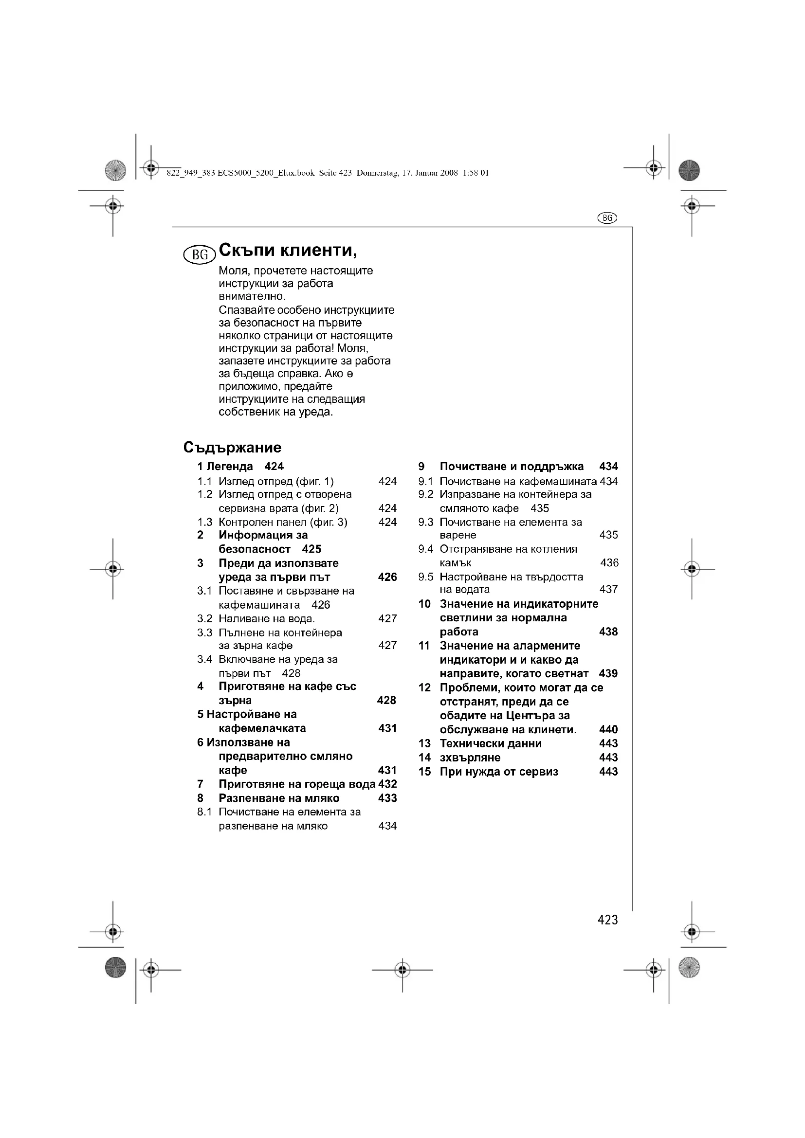 на водата 437 10 Значение на индикаторните светлини за нормална работа 438 11 Значение на алармените индикатори и и какво да направите, когато светнат 439 12 Проблеми, които могат да се отстранят, преди да се обадите на Центъра за обслужване на клинети. 440 13 Технически данни 443 14 зхвърляне 443 15 При нужда от сервиз 443 822_949_383 ECS5000_5200_Elux.book Seite 423 Donnerstag, 17. Januar 2008 1:58 01y