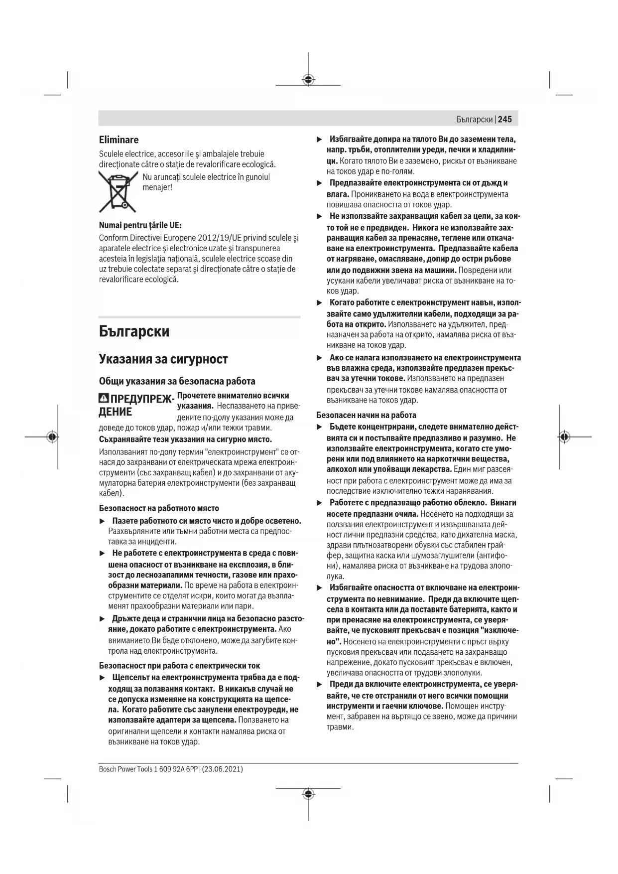 1,5 Посоченото в това ръководство за експлоатация ниво на вибрации е измерено по посочен в стандартите метод и може да служи за сравняване на различни електроинст- рументи. То е подходящо също и за предварителна ори- ентировъчна преценка на натоварването от вибрации. Посоченото ниво на генерираните вибрации е представи- телно за най-често срещаните приложения на електроин- струмента. Все пак, ако електроинструментът се използ- ва за други дейности, с други работни инструменти или ако не бъде поддържан, както е предписано, равнището на генерираните вибрации може да се промени. Това мо- же да увеличи значително сумарното натоварване вслед- ствие на вибрациите за целия работен цикъл. За точната преценка на натоварването от вибрации тряб- ва да бъдат взимани предвид и периодите, в които елект- роинструментът е изключен или работи, но не се ползва. Това би могло значително да намали сумарното натовар- ване от вибрации. Bosch Power Tools 1 609 92A 6PP | (23.06.2021)252 | Български Предписвайте допълнителни мерки за предпазване на работещия с електроинструмента от въздействието на вибрациите, например: техническо обслужване на елект- роинструмента и работните инструменти, поддържане на ръцете топли, целесъобразна организация на работните