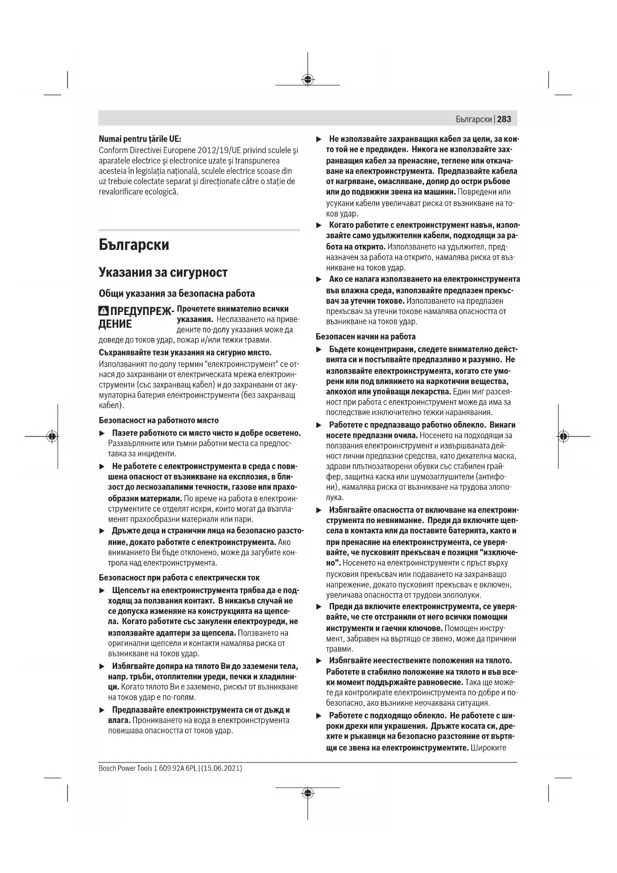 u Когато работите с електроинструмент навън, изпол- звайте само удължителни кабели, подходящи за ра- бота на открито. Използването на удължител, пред- назначен за работа на открито, намалява риска от въз- никване на токов удар. u Ако се налага използването на електроинструмента във влажна среда, използвайте предпазен прекъс- вач за утечни токове. Използването на предпазен прекъсвач за утечни токове намалява опасността от възникване на токов удар. Безопасен начин на работа u Бъдете концентрирани, следете внимателно дейст- вията си и постъпвайте предпазливо и разумно. Не използвайте електроинструмента, когато сте умо- рени или под влиянието на наркотични вещества, алкохол или упойващи лекарства. Един миг разсея- ност при работа с електроинструмент може да има за последствие изключително тежки наранявания. u Работете с предпазващо работно облекло. Винаги носете предпазни очила. Носенето на подходящи за ползвания електроинструмент и извършваната дей- ност лични предпазни средства, като дихателна маска, здрави плътнозатворени обувки със стабилен грай- фер, защитна каска или шумозаглушители (антифо- ни), намалява риска от възникване на трудова злопо-