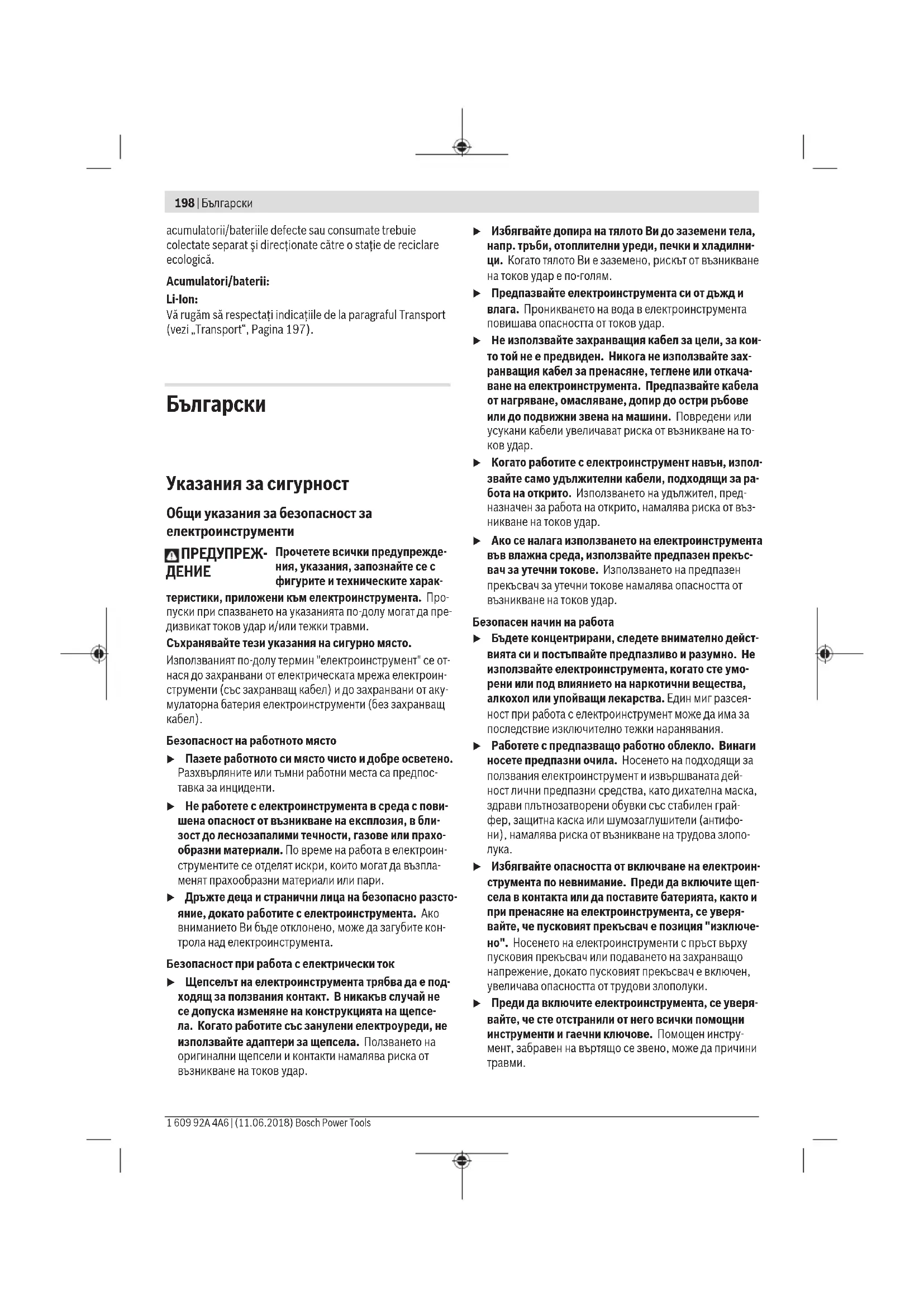 Електроинструментите, акумулаторните ба- терии и допълнителните приспособления трябва да бъдат предавани за оползотворя- ване на съдържащите се в тях суровини. Не изхвърляйте електроинструменти и аку- мулаторни или обикновени батерии при би- товите отпадъци! Само за страни отЕС: Съгласно европейска директива 2012/19/EС електроу- редите, които не могат да се ползват повече, а съгласно европейска директива 2006/66/EО повредени или изха- бени обикновени или акумулаторни батерии трябва да се събират и предава за оползотворяване на съдържащите се в тях суровини. Акумулаторни или обикновени батерии: Литиево-йонни: Български | 207 Bosch Power Tools 1 609 92A 4A6 | (11.06.2018)208 | Македонски 1 609 92A 4A6 | (11.06.2018) Bosch Power Tools Моля, спазвайте указанията в раздела Транспортиране (вж. „Транспортиране“, Страница207).