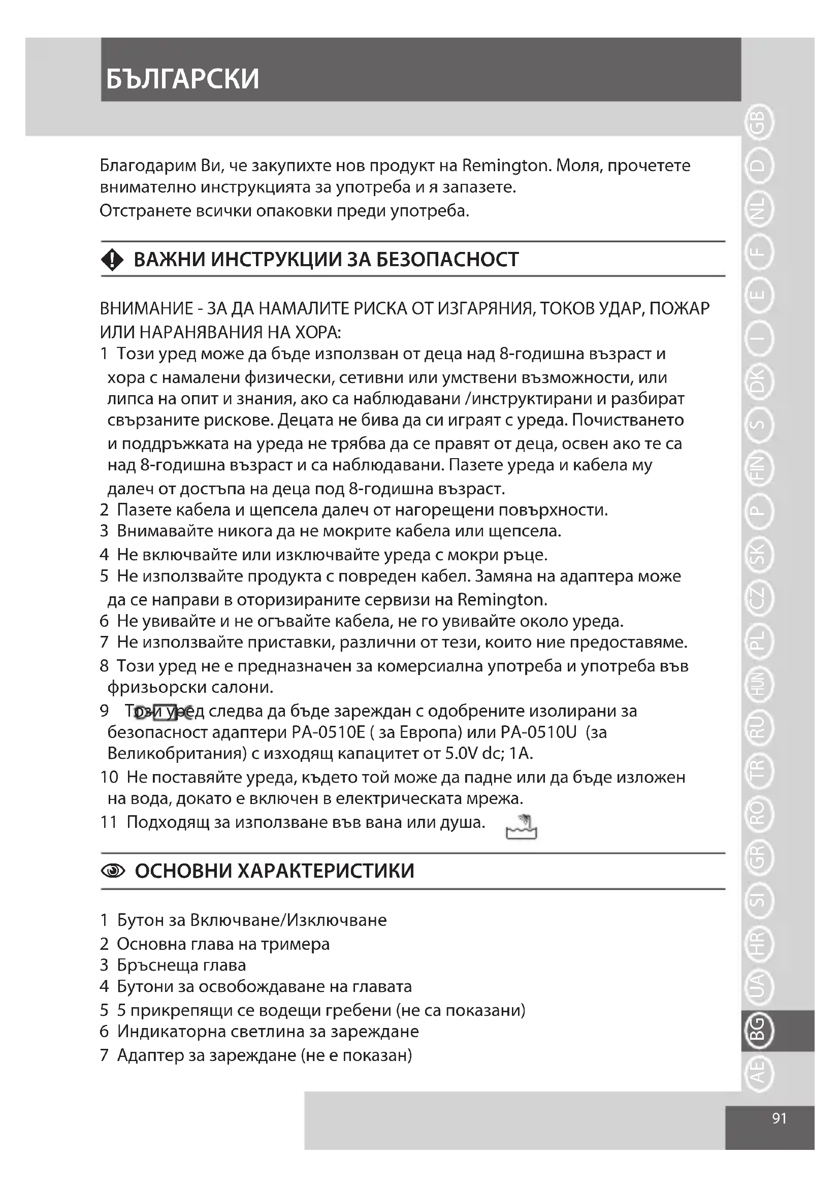 - Після цього слід утилізувати батарею в безпечний спосіб. H ЗАХИСТ НАВКОЛИШНЬОГО СЕРЕДОВИЩА Для уникнення нанесення шкоди навколишньому середовищу та здоров'ю людей, що пов'язана із використанням небезпечних речовин в електричних та електронних товарах, позначені вказаним символом пристрої не слід утилізувати разом із невідсортованим побутовим сміттям. Такі пристрої підлягають відновленню, повторному використанню або переробці. УКРАЇНСЬКА91 Благодарим Ви, че закупихте нов продукт на Remington. Моля, прочетете внимателно инструкцията за употреба и я запазете. Отстранете всички опаковки преди употреба. F ВАЖНИ ИНСТРУКЦИИ ЗА БЕЗОПАСНОСТ ВНИМАНИЕ - ЗА ДА НАМАЛИТЕ РИСКА ОТ ИЗГАРЯНИЯ, ТОКОВ УДАР, ПОЖАР ИЛИ НАРАНЯВАНИЯ НА ХОРА: 1 Този уред може да бъде използван от деца над 8-годишна възраст и хора с намалени физически, сетивни или умствени възможности, или липса на опит и знания, ако са наблюдавани /инструктирани и разбират свързаните рискове. Децата не бива да си играят с уреда. Почистването и поддръжката на уреда не трябва да се правят от деца, освен ако те са над 8-годишна възраст и са наблюдавани. Пазете уреда и кабела му далеч от достъпа на деца под 8-годишна възраст. 2 Пазете кабела и щепсела далеч от нагорещени повърхности. 3 Внимавайте никога да не мокрите кабела или щепсела. 4 Не включвайте или изключвайте уреда с мокри ръце. 5 Не използвайте продукта с повреден кабел. Замяна на адаптера може да се направи в оторизираните сервизи на Remington. 6 Не увивайте и не огъвайте кабела, не го увивайте около уреда. 7 Не използвайте приставки, различни от тези, които ние предоставяме. 8 Този уред не е предназначен за комерсиална употреба и употреба във фризьорски салони. 9 Този уред следва да бъде зареждан с одобрените изолирани за безопасност адаптери PA-0510E ( за Европа) или PA-0510U (за Великобритания) с изходящ капацитет от 5.0V dc; 1A. 10 Не поставяйте уреда, където той може да падне или да бъде изложен на вода, докато е включен в електрическата мрежа. 11 Подходящ за използване във вана или душа. C ОСНОВНИ ХАРАКТЕРИСТИКИ 1 Бутон за Включване/Изключване 2 Основна глава на тримера 3 Бръснеща глава 4 Бутони за освобождаване на главата 5 5 прикрепящи се водещи гребени (не са показани) 6 Индикаторна светлина за зареждане 7 Адаптер за зареждане (не е показан) GBDNLFEIDKSFINPSKCZ HUN PLRUTRROGRSIBG HRUAAE БЪЛГАРСКИ92 8 Модул с ножове 9 Бръснеща мрежа C ПОДГОТОВКА ЗА УПОТРЕБА Внимавайте, когато използвате тримера за първи път. Както при всеки нов продукт, може да отнеме известно време докато свикнете с продукта. , ИНСТРУКЦИИ ЗА ЗАРЕЖДАНЕ