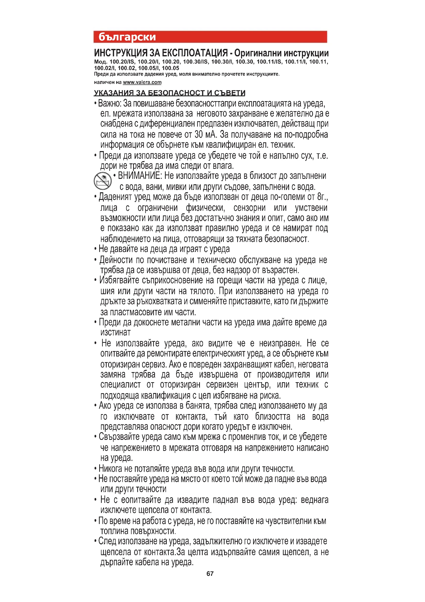 на конструкцията или неупълномощен ремонт. В случай на възникване на каквато и да е неизправност, занесете опакованият в оригиналната опаковка уред заедно с попълнената гаранционна карта с указана дата на закупуване и заверена с печат на продавача в някой от нашите сервизни центрове или при продавача, за да може да бъде обслужен гаранционно. Независимо от търговската гаранция продавачът отговаря за липсата на съответствие на потребителската стока с договора за покупко продажба съгласно разпоредбите на ЗЗП. ФУНКЦИЯ "ION" (Йонизация) (само за модели 100.20/IS, 100.20/I, 100.30/IS, 100.30/I, 100.11/IS, 100.11/I, 100.02/I, 100.05/I) Даденият уред е оборудван с функцията "ION" (Йонизация), действаща през цялото време на работата му.Уедът създава поток от отрицателно заредени йони.Лекото бръмчене, съпътстващо работата на генератора на йони, трябва да се счита за нормално явление. Какво е това йони? притежаващи електрически заряд. Отрицателно заредените йони спомагат за пречистването на въздуха, неутрализирайки йоните с положителен заряд, които обратно - спомагат за влошаване състоянието на въздуха, задържайки в атмосферата голямо число замърсяващи елементи. Високо съдържание на отрицателни йони във въздуха се наблюдава след буря, на морето или в планината, в близост до водопади или водни потоци; тогава човек изпитва чувство на комфорт, благодарение на чистия, свеж и живителен въздух. По-доброто хидратиране на косата Отрицателно заредените йони способстват за съхраняване на необходимото хидратиране на вашата коса. Ефект на балсам По-доброто хидратиране способства за подобряване състоянието на косата ви. Оказва възстановяващ ефект и я прави по мека и лесна за разресване. Увеличава обема и блясъка. Отсътвие на статично електричество и ефекта "летящи" коси Отрицателно заредените йони способстват за намаляване на статтичното електричество и ефекта на "летящи" коси (тогава когата косата ви се е разпръснала във всички посоки), а също така прави косата по гладка. Важна информация: не оставяйте без надзор уреда по време на неговата работа СЪВЕТИ ПО ИЗПОЛЗВАНЕ НА