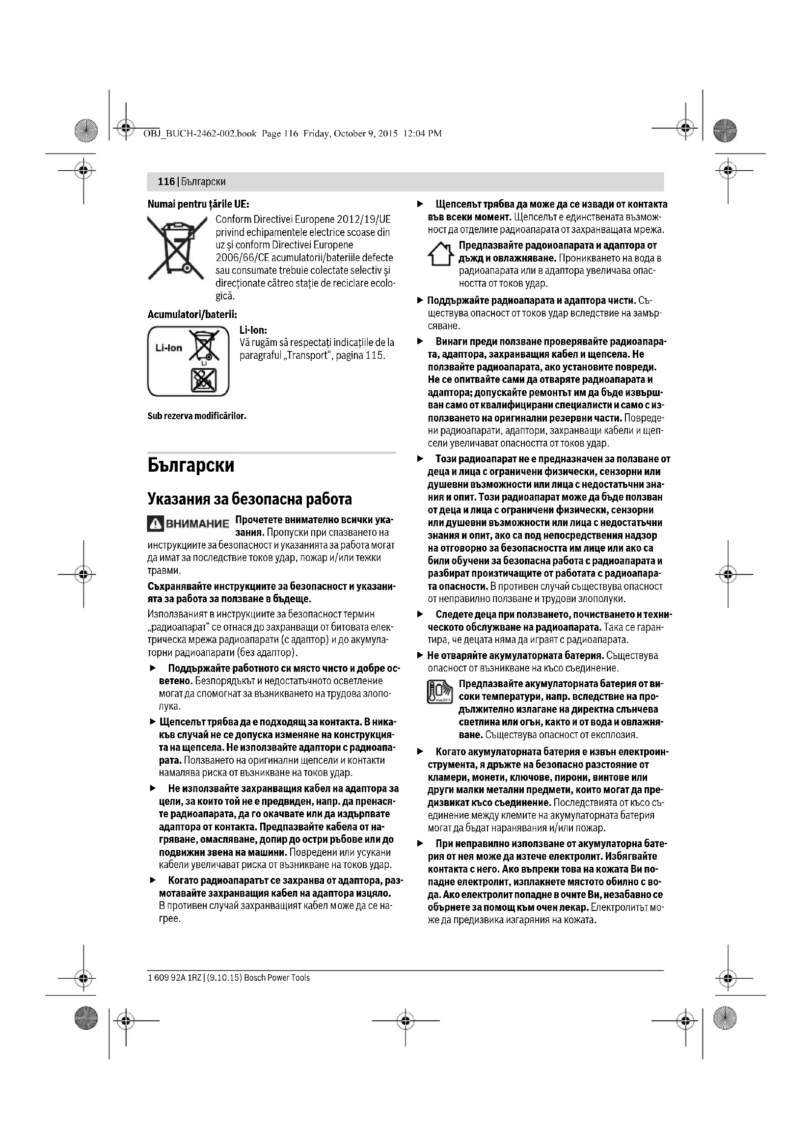 С оглед опазване на околната среда радиоапарати- те, захранващите адаптори, обикновените или аку- мулаторни батерии, допълнителните приспосо- бления и опаковките трябва да бъдат предавани за оползо- творяване на съдържащите се в тях суровини. Не изхвърляйте радиоапарати, захранващи адаптори, обик- новени или акумулаторни батерии при битовите отпадъци! Само за страни от ЕС: Съгласно Европейска директива 2012/19/EC електрически уреди, а съ- гласно Европейска директива 2006/66/ЕО акумулаторни или обикнове- ни батерии, които не могат да се използват повече, трябва да се събират отделно и да бъдат подлагани на подходяща преработка за оползотво- ряване на съдържащите се в тях суровини. Акумулаторни или обикновени батерии: Li-Ion: Моля, спазвайте указанията в раз- дел „Транспортиране“, страница 121. Правата за изменения запазени.