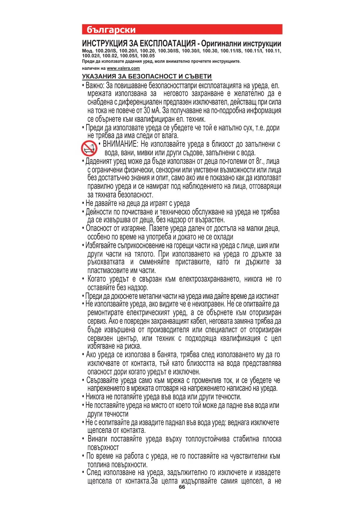 на конструкцията или неупълномощен ремонт. В случай на възникване на каквато и да е неизправност, занесете опакованият в оригиналната опаковка уред заедно с попълнената гаранционна карта с указана дата на закупуване и заверена с печат на продавача в някой от нашите сервизни центрове или при продавача, за да може да бъде обслужен гаранционно. Независимо от търговската гаранция продавачът отговаря за липсата на съответствие на потребителската стока с договора за покупко продажба съгласно разпоредбите на ЗЗП. ФУНКЦИЯ "ION" (Йонизация) (само за модели 100.20/IS, 100.20/I, 100.30/IS, 100.30/I, 100.11/IS, 100.11/I, 100.02/I, 100.05/I) Даденият уред е оборудван с функцията "ION" (Йонизация), действаща през цялото време на работата му.Уедът създава поток от отрицателно заредени йони.Лекото бръмчене, съпътстващо работата на генератора на йони, трябва да се счита за нормално явление. Какво е това йони? притежаващи електрически заряд. Отрицателно заредените йони спомагат за пречистването на въздуха, неутрализирайки йоните с положителен заряд, които обратно - спомагат за влошаване състоянието на въздуха, задържайки в атмосферата голямо число замърсяващи елементи. Високо съдържание на отрицателни йони във въздуха се наблюдава след буря, на морето или в планината, в близост до водопади или водни потоци; тогава човек изпитва чувство на комфорт, благодарение на чистия, свеж и живителен въздух. По-доброто хидратиране на косата Отрицателно заредените йони способстват за съхраняване на необходимото хидратиране на вашата коса. Ефект на балсам По-доброто хидратиране способства за подобряване състоянието на косата ви. Оказва възстановяващ ефект и я прави по мека и лесна за разресване. Увеличава обема и блясъка. Отсътвие на статично електричество и ефекта "летящи" коси Отрицателно заредените йони способстват за намаляване на статтичното електричество и ефекта на "летящи" коси (тогава когата косата ви се е разпръснала във всички посоки), а също така прави косата по гладка. Важна информация: не оставяйте без надзор уреда по време на неговата работа