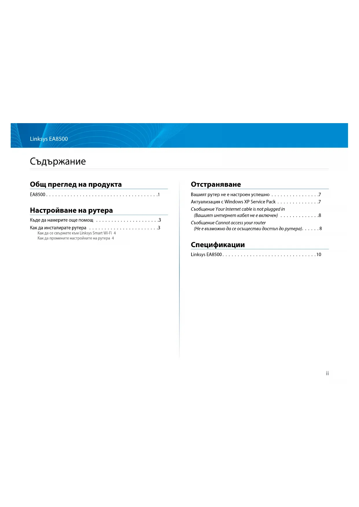 - Съобщение Your Internet cable is not plugged in (Вашият интернет кабел не е включен) Съобщение Cannot access your router (Не е възможно да се осъществи достъп до рутера) p. 8