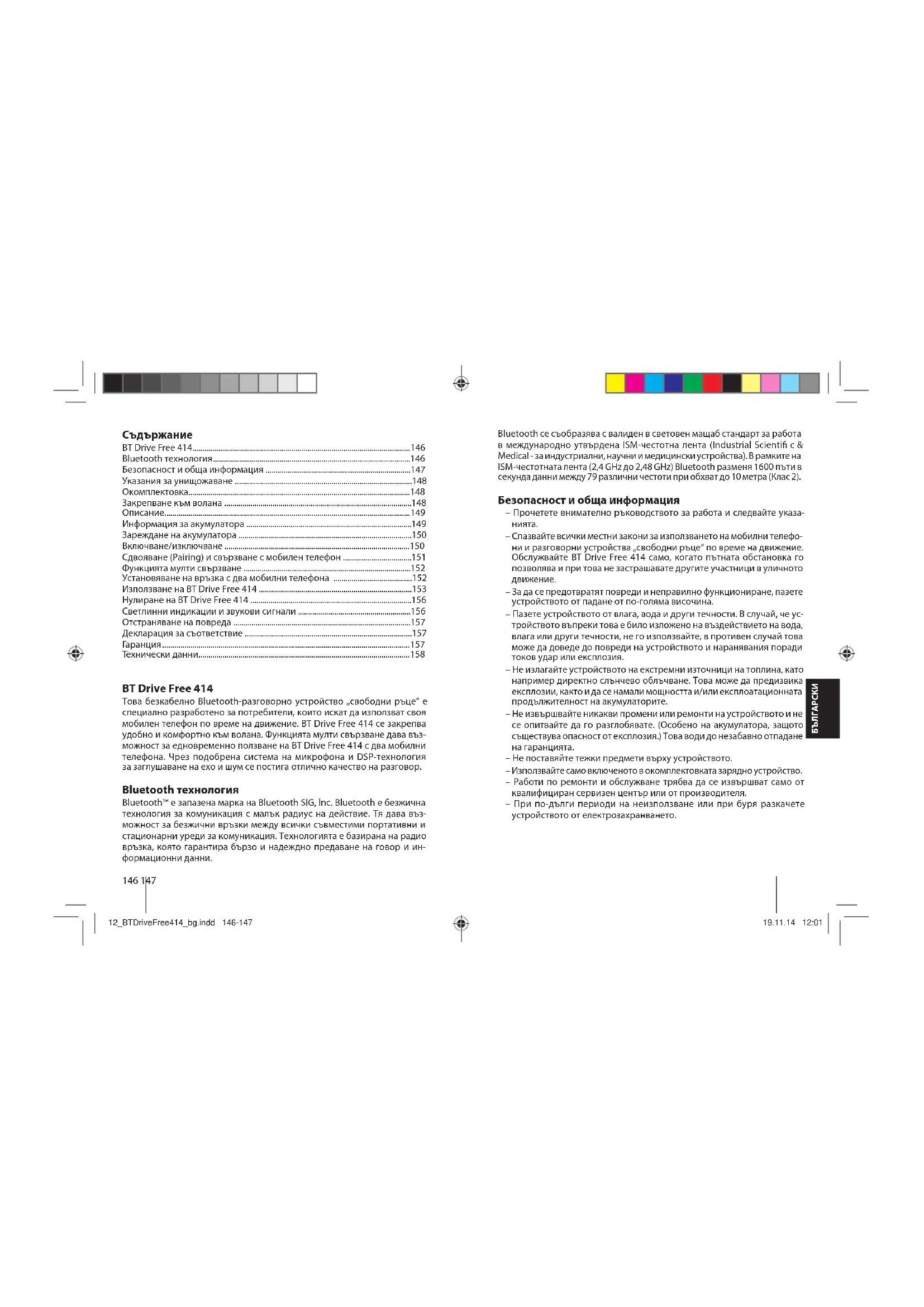 - Технически данни BT Drive Free 414 Това безкабелно Bluetooth-разговорно устройство „свободни ръце“ е специално разработено за потребители, които искат да използват своя мобилен телефон по време на движение. BT Drive Free 414 се закрепва удобно и комфортно към волана. Функцията мулти свързване дава въз- можност за едновременно ползване на BT Drive Free 414 с два мобилни телефона. Чрез подобрена система на микрофона и DSP-технология за заглушаване на ехо и шум се постига отлично качество на разговор. Bluetooth технология Bluetooth™ е запазена марка на Bluetooth SIG, lnc. Bluetooth е безжична технология за комуникация с малък радиус на действие. Тя дава въз- можност за безжични връзки между всички съвместими портативни и стационарни уреди за комуникация. Технологията е базирана на радио връзка, която гарантира бързо и надеждно предаване на говор и ин- формационни данни. Bluetooth се съобразява с валиден в световен мащаб стандарт за работа в международно утвърдена ISM-честотна лента (Industrial Scienti c & Medical - за индустриални, научни и медицински устройства). В рамките на ISM-честотната лента (2,4 GHz до 2,48 GHz) Bluetooth разменя 1600 пъти в секунда данни между 79 различни честоти при обхват до 10 метра (Клас 2). Безопасност и обща информация – Прочетете внимателно ръководството за работа и следвайте указа- p. 158