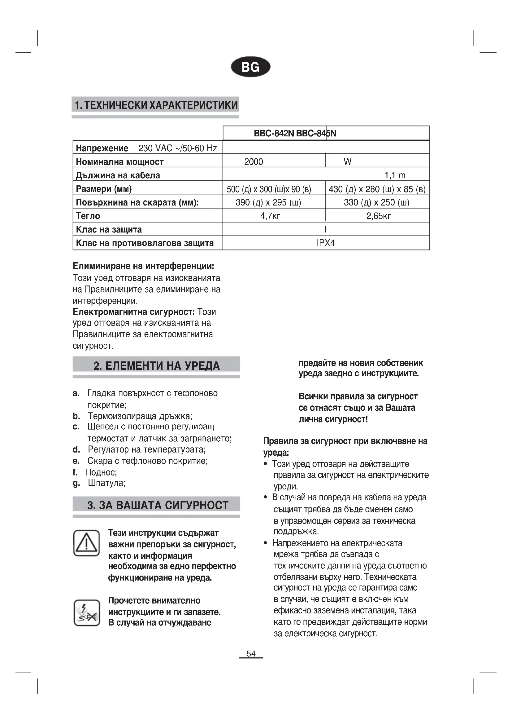 Напрежение 230 VAC ~/50-60 Hz Номинална мощност 2000 W 2000W Дължина на кабела 1,1 m Размери (мм) 500 (д) x 300 (ш)x 90 (в) 430 (д) x 280 (ш) x 85 (в) Повърхнина на скарата (мм): 390 (д) x 295 (ш) 330 (д) x 250 (ш) Тегло 4,7кг 2,65кг Клас на защита I Клас на противовлагова защита IPX4 BG55