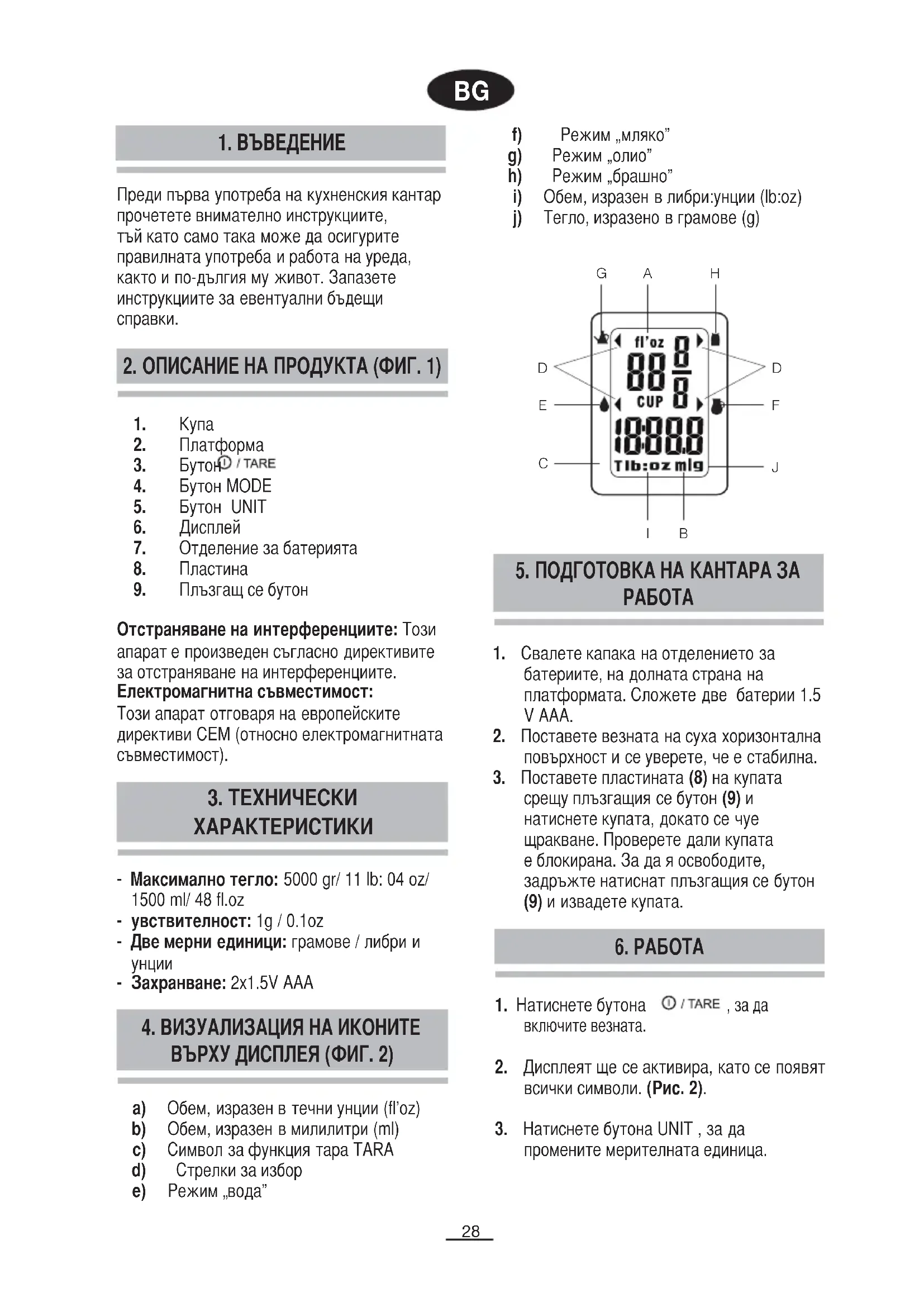 ПРЕТОВАРВАЙТЕ КАНТАРА Ако превишите максималното тегло може да повредите кантара. В случай, че превишите теглото на дисплея се появява предупредително