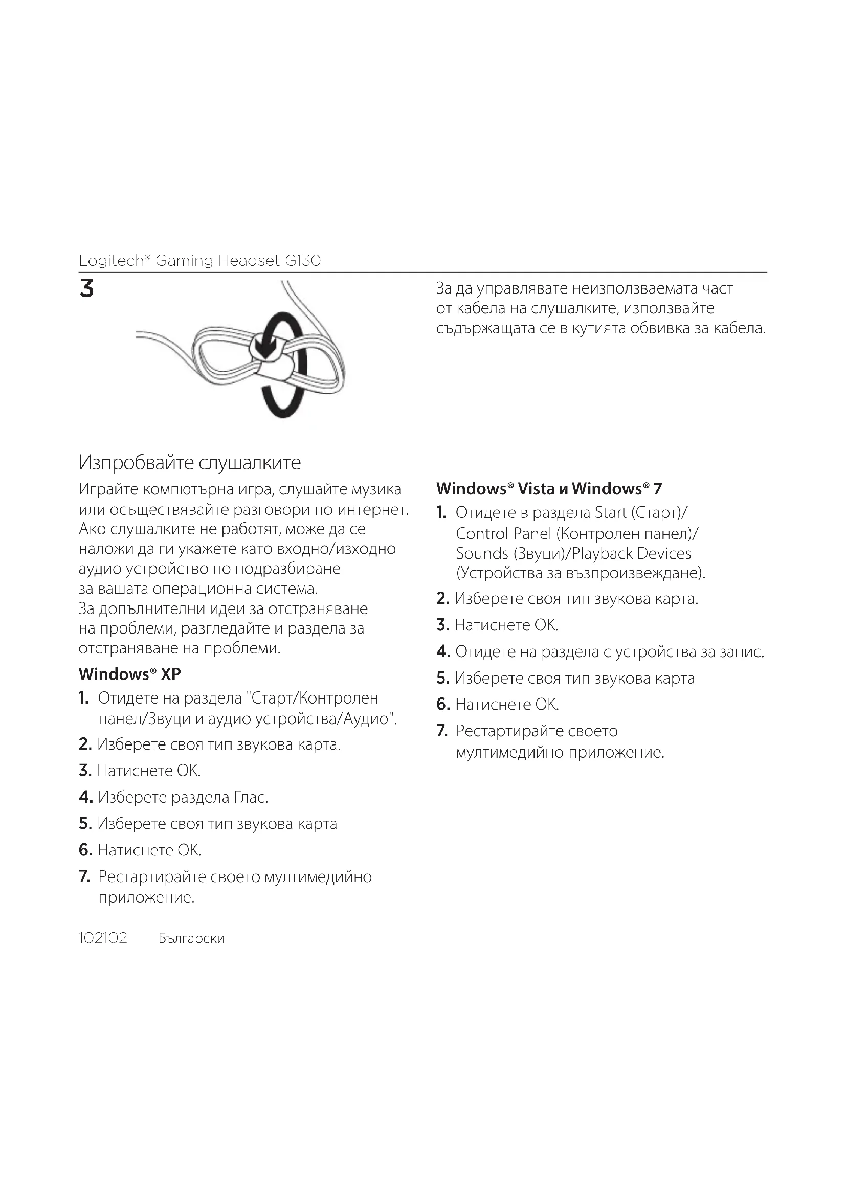 За да управлявате неизползваемата част от кабела на слушалките, използвайте съдържащата се в кутията обвивка за кабела. Изпробвайте слушалките Играйте компютърна игра, слушайте музика или осъществявайте разговори по интернет. Ако слушалките не работят, може да се наложи да ги укажете като входно/изходно аудио устройство по подразбиране за вашата операционна система. За допълнителни идеи за отстраняване на проблеми, разгледайте и раздела за отстраняване на проблеми. Windows® XP