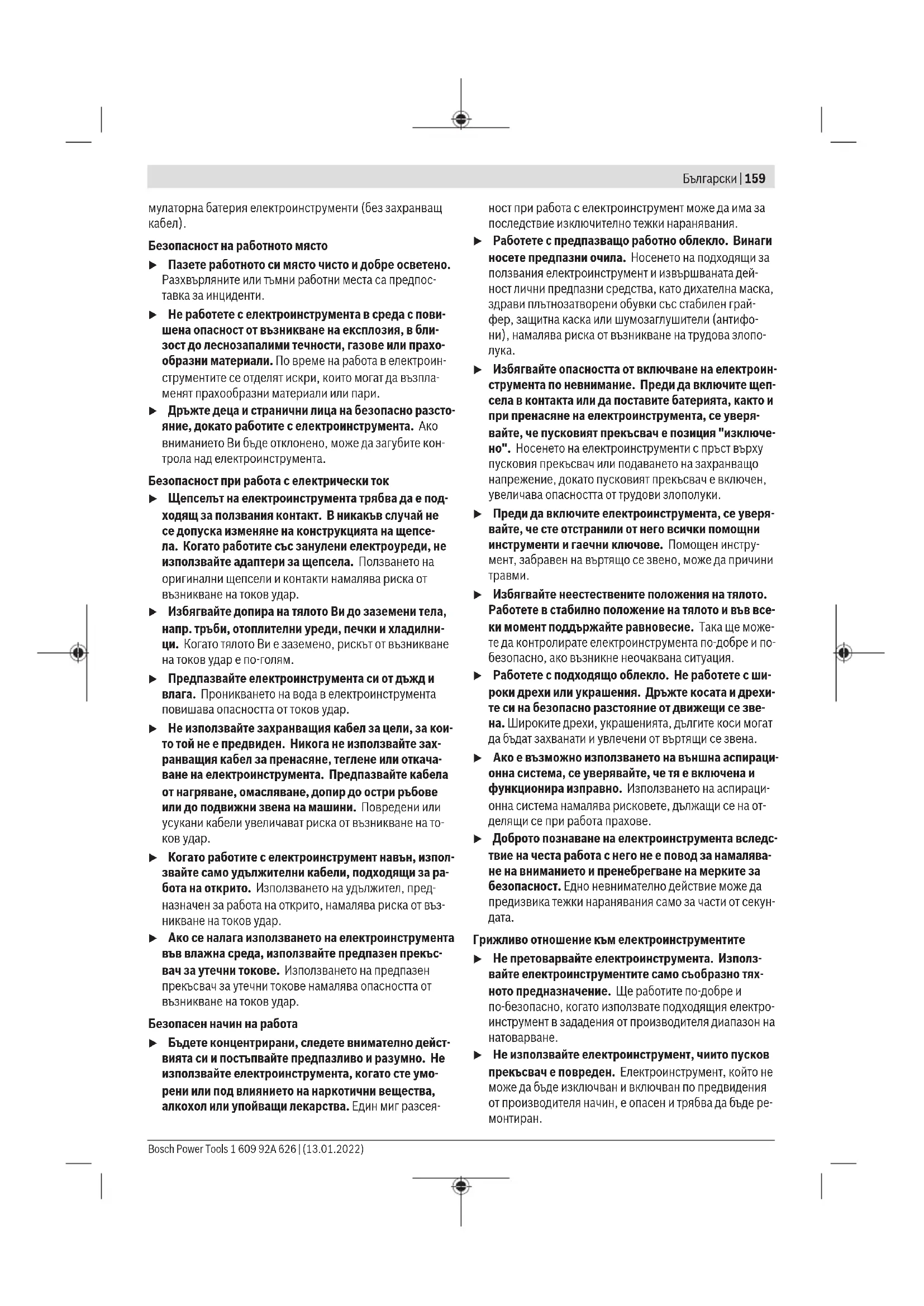 Прочетете всички предупрежде- ния, указания, запознайте се с фигурите и техническите харак- теристики, приложени към електроинструмента. Про- пуски при спазването на указанията по-долу могат да пре- дизвикат токов удар и/или тежки травми. Съхранявайте тези указания на сигурно място. Използваният по-долу термин "електроинструмент" се от- нася до захранвани от електрическата мрежа електроин- струменти (със захранващ кабел) и до захранвани от аку- 1 609 92A 626 | (13.01.2022) Bosch Power ToolsБългарски | 159 мулаторна батерия електроинструменти (беззахранващ