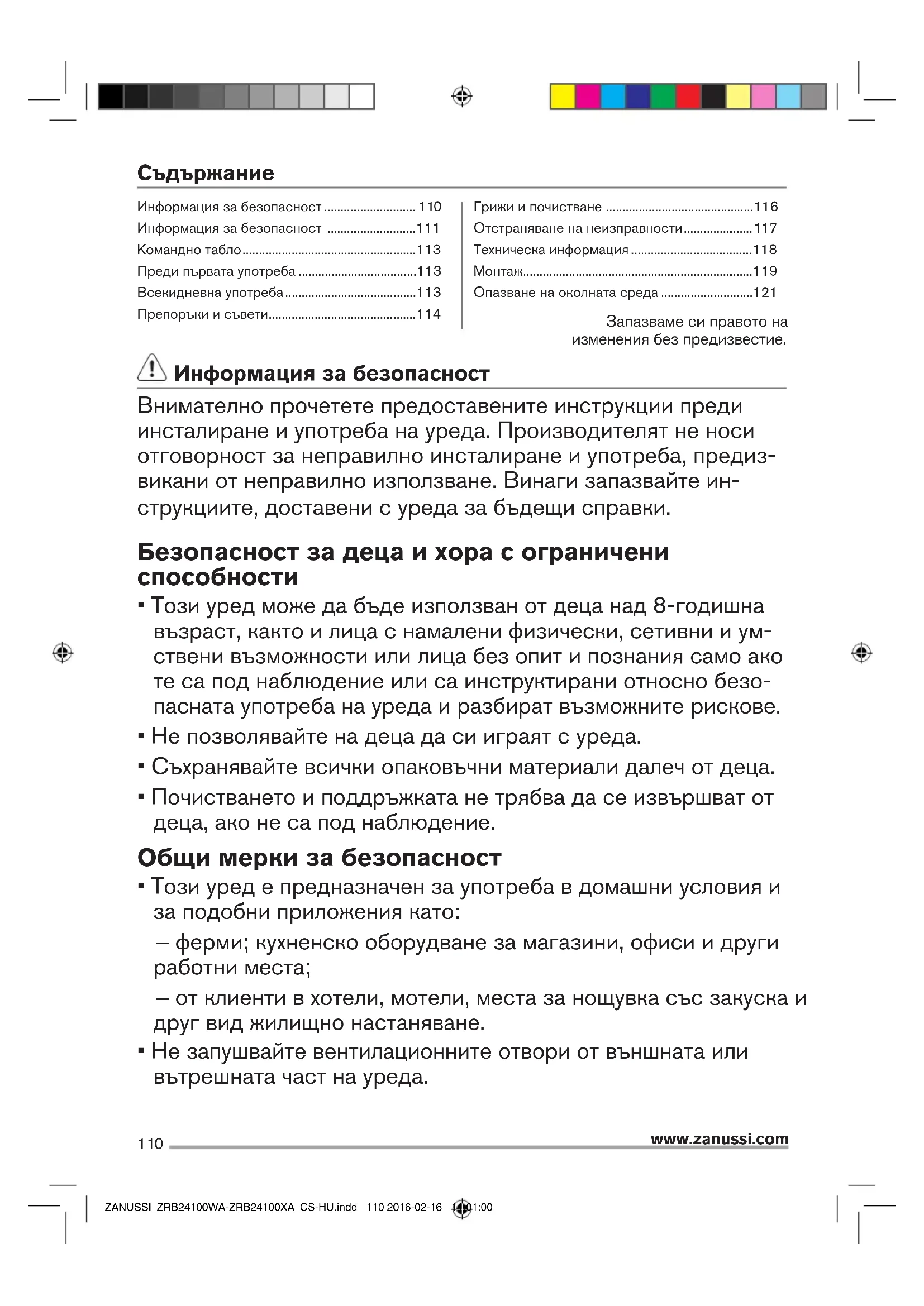 - Не запушвайте вентилационните отвори от външната или вътрешната част на уреда. Информация за безопасност ............................ 110 Информация за безопасност ...........................111 Kомандно табло .....................................................113 Преди първата употреба ....................................113 Всекидневна употреба ........................................113 Препоръки и съвети .............................................114 Грижи и почистване .............................................116 Отстраняване на неизправности ..................... 117 Техническа информация .....................................118 Монтаж ......................................................................119 Опазване на околната среда ............................121 ZANUSSI_ZRB24100WA-ZRB24100XA_CS-HU.indd 110 2016-02-16 11:01:00111 www.zanussi.com