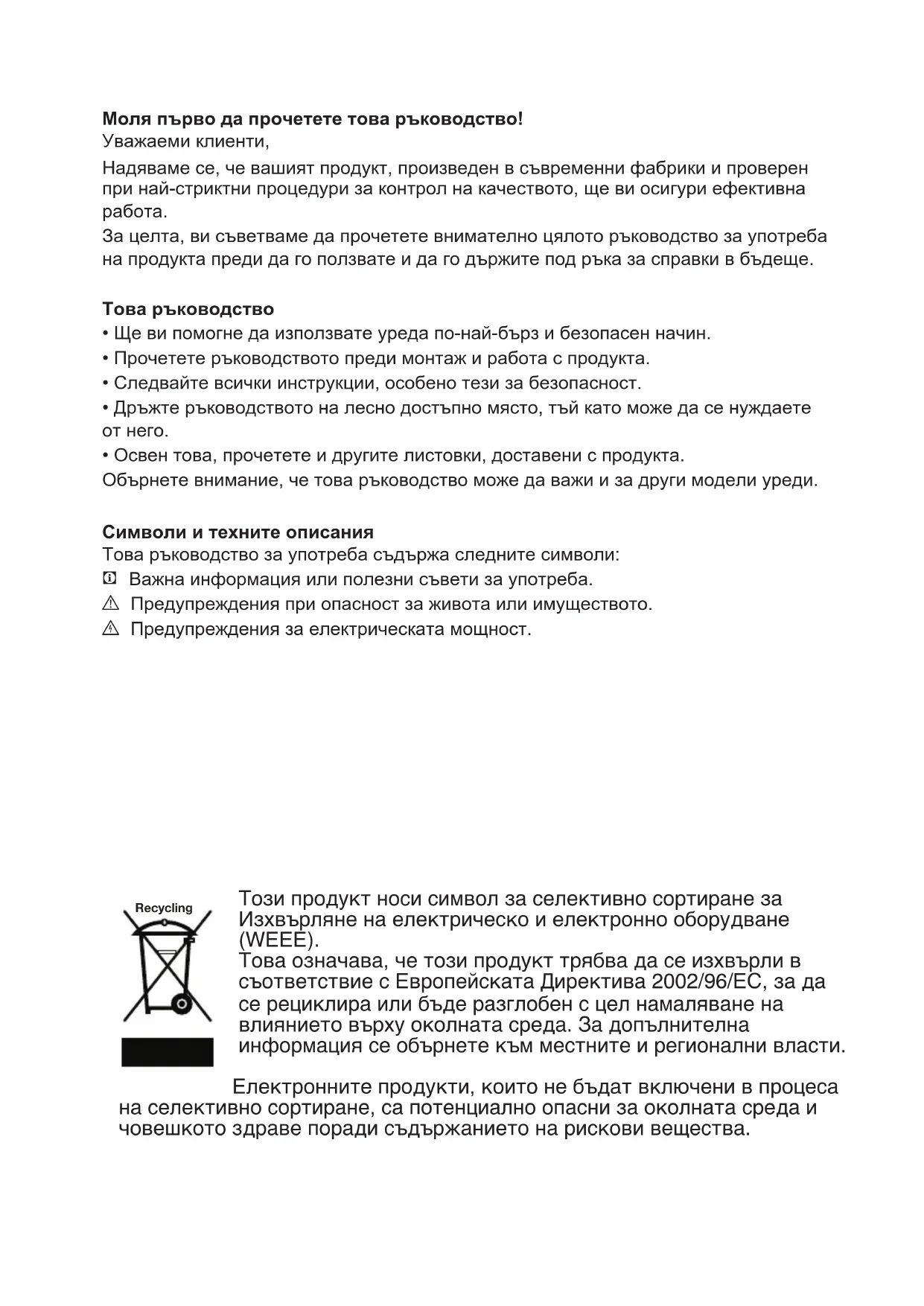 Важна информация или полезни съвети за употреба. A Предупреждения при опасност за живота или имуществото. B Предупреждения за електрическата мощност. Този продукт носи символ за селективно сортиране за Изхвърляне на електрическо и електронно оборудване (WEEE). Това означава, че този продукт трябва да се изхвърли в съответствие с Европейската Директива 2002/96/EC, за да се рециклира или бъде разглобен с цел намаляване на влиянието върху околната среда. За допълнителна информация се обърнете към местните и регионални власти. Електронните продукти, които не бъдат включени в процеса на селективно сортиране, са потенциално опасни за околната среда и човешкото здраве поради съдържанието на рискови вещества. RecyclingBG