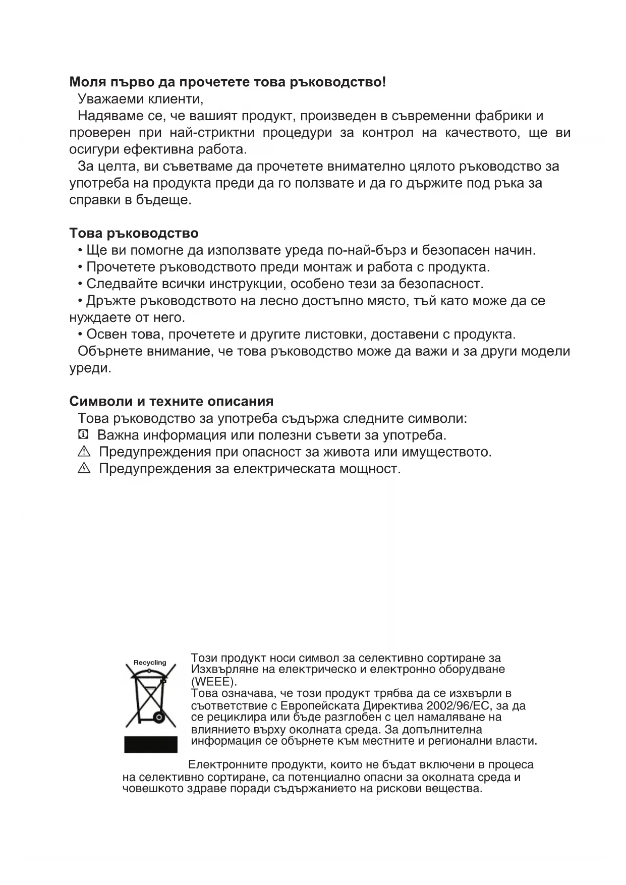 Символи и техните описания Това ръководство за употреба съдържа следните символи: C Важна информация или полезни съвети за употреба. A Предупреждения при опасност за живота или имуществото. B Предупреждения за електрическата мощност. Този продукт носи символ за селективно сортиране за Изхвърляне на електрическо и електронно оборудване (WEEE). Това означава, че този продукт трябва да се изхвърли в съответствие с Европейската Директива 2002/96/EC, за да се рециклира или бъде разглобен с цел намаляване на влиянието върху околната среда. За допълнителна информация се обърнете към местните и регионални власти. Електронните продукти, които не бъдат включени в процеса на селективно сортиране, са потенциално опасни за околната среда и човешкото здраве поради съдържанието на рискови вещества. RecyclingBG
