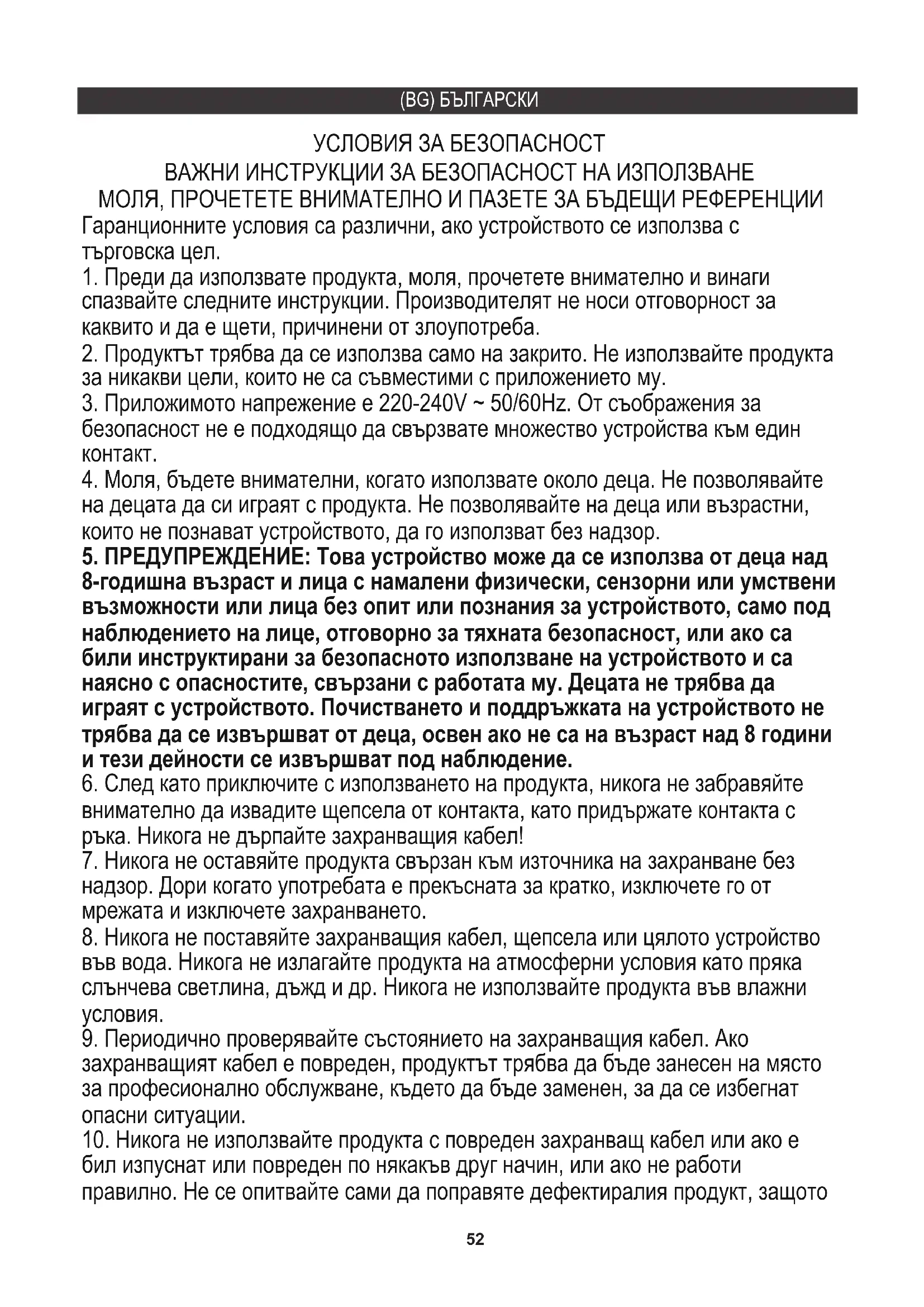 на децата да си играят с продукта. Не позволявайте на деца или възрастни, които не познават устройството, да го използват без надзор. УСЛОВИЯ ЗА БЕЗОПАСНОСТ Гаранционните условия са различни, ако устройството се използва с търговска цел.