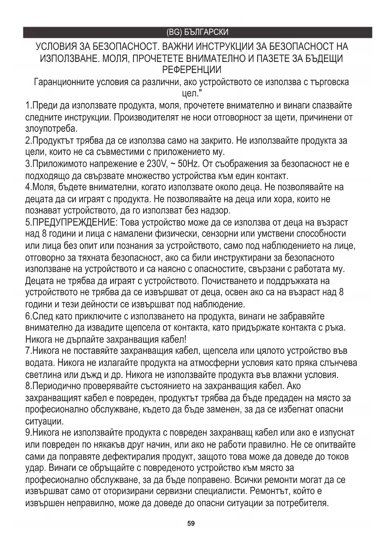 ﺪﯾﺪﮭﺗ تﺎﻧﻮﻜﻤﻟا ﻞﻜﺸﺗ ﺪﻗ زﺎﮭﺠﻟا ﻲﻓ تﺎﯾرﺎﻄﺑ كﺎﻨھ نﺎﻛ اذإ .ﺎﮭﻣاﺪﺨﺘﺳاو ﺎﮭﻣاﺪﺨﺘﺳا ةدﺎﻋإ ،.ﻞﺼﻔﻨﻣ ﻞﻜﺸﺑ ﺔﻧﺰﺨﻤﻟا ﺔﻄﻘﻨﻟا ﻰﻟإ ﺎﮭﺋﺎﻄﻋإو ﺎﮭﺟاﺮﺧإ ﻚﯿﻠﻌﻓ59 3.Приложимото напрежение е 230V, ~ 50Hz. От съображения за безопасност не е подходящо да свързвате множество устройства към един контакт. 6.След като приключите с използването на продукта, винаги не забравяйте внимателно да извадите щепсела от контакта, като придържате контакта с ръка. Никога не дърпайте захранващия кабел! 7.Никога не поставяйте захранващия кабел, щепсела или цялото устройство във водата. Никога не излагайте продукта на атмосферни условия като пряка слънчева светлина или дъжд и др. Никога не използвайте продукта във влажни условия. УСЛОВИЯ ЗА БЕЗОПАСНОСТ. ВАЖНИ ИНСТРУКЦИИ ЗА БЕЗОПАСНОСТ НА ИЗПОЛЗВАНЕ. МОЛЯ, ПРОЧЕТЕТЕ ВНИМАТЕЛНО И ПАЗЕТЕ ЗА БЪДЕЩИ