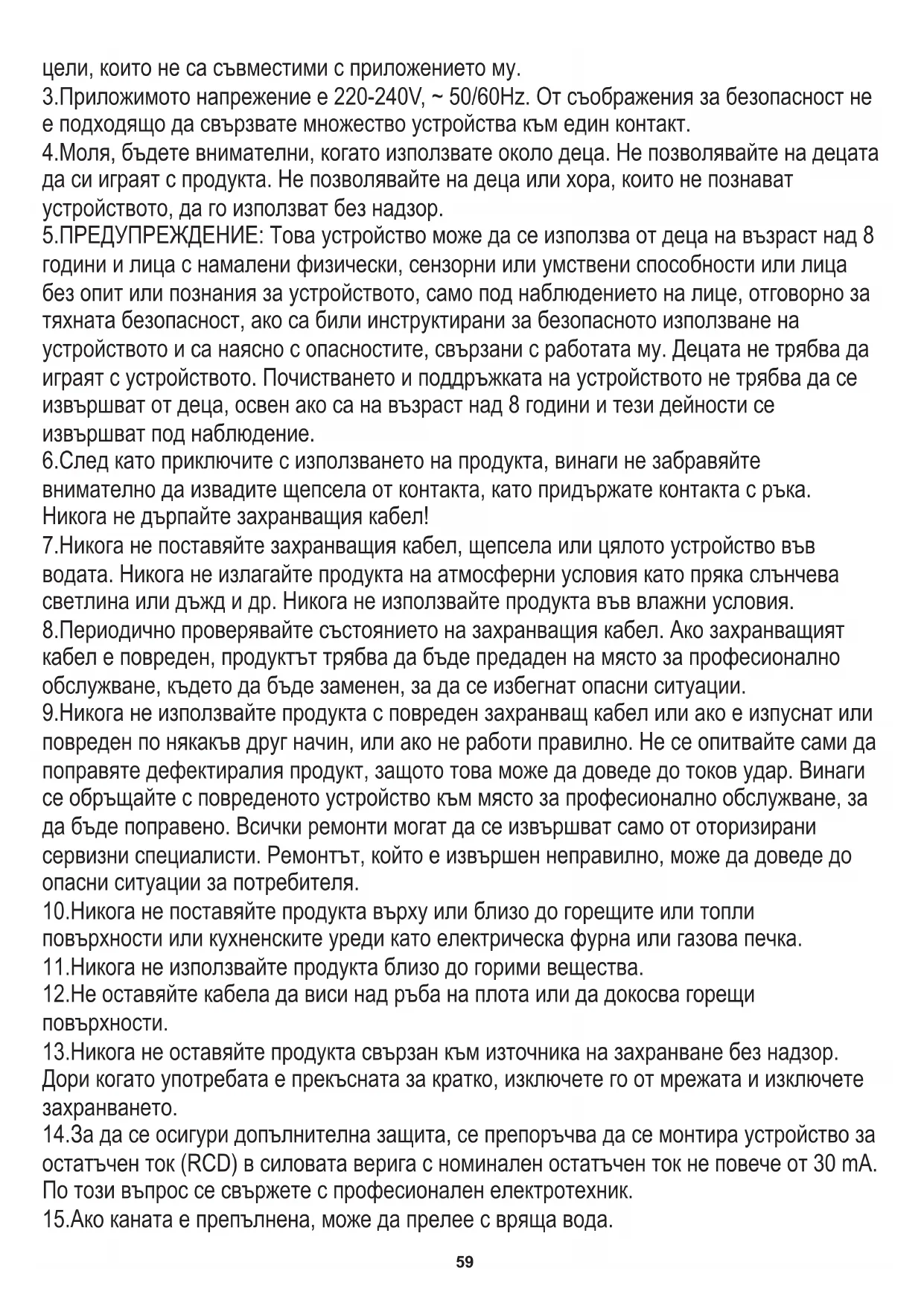 Гаранционните условия са различни, ако устройството се използва с търговска цел." 2.Продуктът трябва да се използва само на закрито. Не използвайте продукта за (BG) БЪЛГАРСКИ59 14.За да се осигури допълнителна защита, се препоръчва да се монтира устройство за остатъчен ток (RCD) в силовата верига с номинален остатъчен ток не повече от 30 mA. По този въпрос се свържете с професионален електротехник. 8.Периодично проверявайте състоянието на захранващия кабел. Ако захранващият кабел е повреден, продуктът трябва да бъде предаден на място за професионално обслужване, където да бъде заменен, за да се избегнат опасни ситуации. 9.Никога не използвайте продукта с повреден захранващ кабел или ако е изпуснат или повреден по някакъв друг начин, или ако не работи правилно. Не се опитвайте сами да поправяте дефектиралия продукт, защото това може да доведе до токов удар. Винаги се обръщайте с повреденото устройство към място за професионално обслужване, за да бъде поправено. Всички ремонти могат да се извършват само от оторизирани сервизни специалисти. Ремонтът, който е извършен неправилно, може да доведе до опасни ситуации за потребителя. 4.Моля, бъдете внимателни, когато използвате около деца. Не позволявайте на децата да си играят с продукта. Не позволявайте на деца или хора, които не познават устройството, да го използват без надзор. 3.Приложимото напрежение е 220-240V, ~ 50/60Hz. От съображения за безопасност не е подходящо да свързвате множество устройства към един контакт. 12.Не оставяйте кабела да виси над ръба на плота или да докосва горещи повърхности. 7.Никога не поставяйте захранващия кабел, щепсела или цялото устройство във водата. Никога не излагайте продукта на атмосферни условия като пряка слънчева светлина или дъжд и др. Никога не използвайте продукта във влажни условия. 15.Ако каната е препълнена, може да прелее с вряща вода. цели, които не са съвместими с приложението му. 11.Никога не използвайте продукта близо до горими вещества. 13.Никога не оставяйте продукта свързан към източника на захранване без надзор. Дори когато употребата е прекъсната за кратко, изключете го от мрежата и изключете захранването. 5.ПРЕДУПРЕЖДЕНИЕ: Това устройство може да се използва от деца на възраст над 8 години и лица с намалени физически, сензорни или умствени способности или лица без опит или познания за устройството, само под наблюдението на лице, отговорно за тяхната безопасност, ако са били инструктирани за безопасното използване на устройството и са наясно с опасностите, свързани с работата му. Децата не трябва да играят с устройството. Почистването и поддръжката на устройството не трябва да се извършват от деца, освен ако са на възраст над 8 години и тези дейности се извършват под наблюдение. 10.Никога не поставяйте продукта върху или близо до горещите или топли повърхности или кухненските уреди като електрическа фурна или газова печка. 6.След като приключите с използването на продукта, винаги не забравяйте внимателно да извадите щепсела от контакта, като придържате контакта с ръка. Никога не дърпайте захранващия кабел!60 19.Това оборудване е предназначено за домашна и подобна употреба, като например: кухни за персонал в магазини, офиси и други работни среди, помощни помещения, от клиенти в хотели, мотели и други жилищни среди от този тип, в спални и трапезарии. 20.Винаги