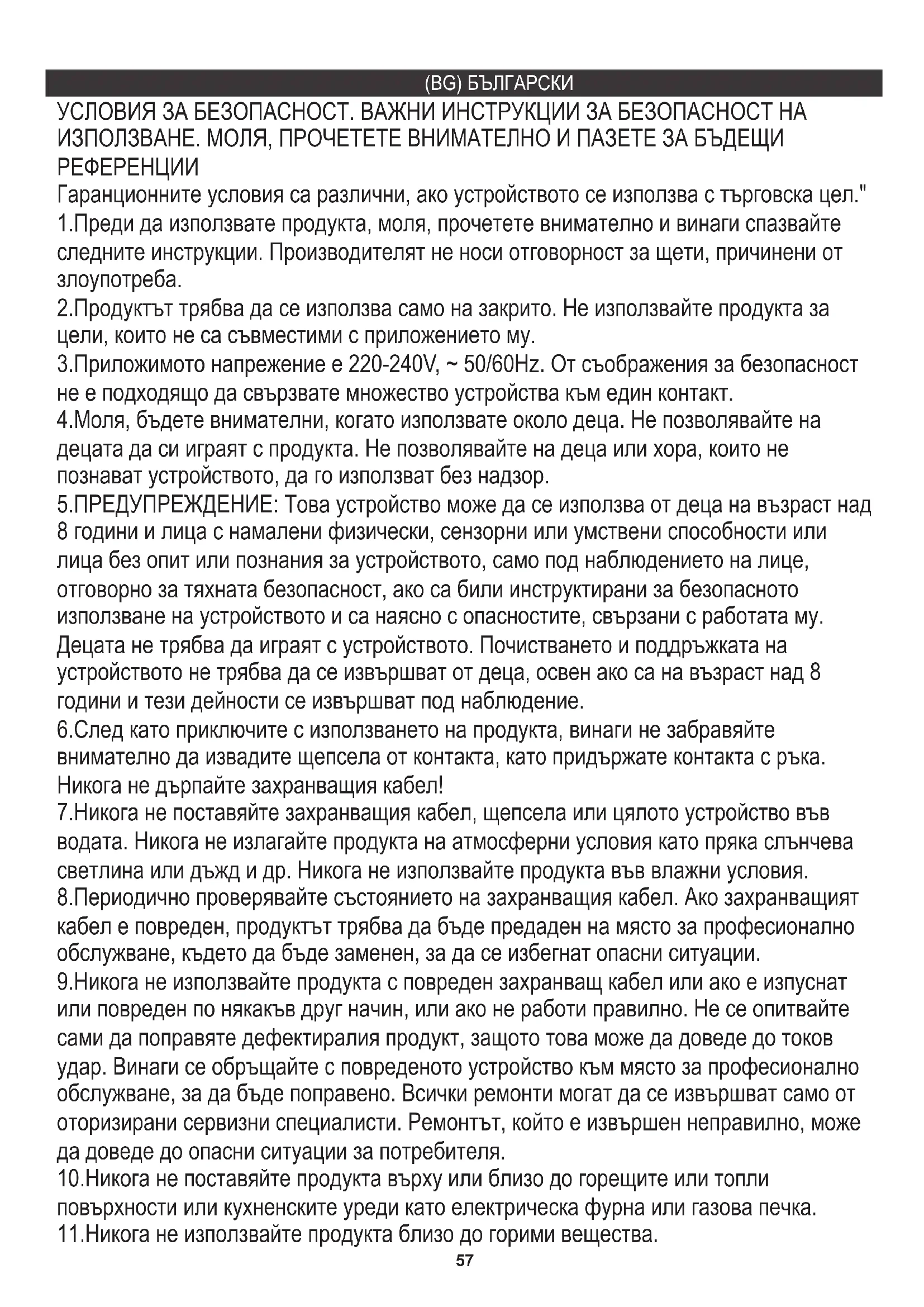 Avkalka regelbundet vattenkokaren. Avkalkning hör inte till garantitjänster. Avsaknad av regelbunden avkalkning orsakar skador på apparatens delar och avbryter garantin på produkten. Använd avkalkningsblandningen för att avkalka vattenkokaren. TEKNISK DATA: 10. Om du stänger av tom vattenkokare, eller med otillräcklig vattennivå, kommer det att automatiskt stänga av vattenkokaren. Vänta tills svalna ner vattenkokaren, häll tillräckligt med vatten och slå på vattenkokaren efter några minuter. Kapacitet max: 1,7l min: 0,5l Vi sköter om miljön. Överlämna förpackningar i kartong till pappersavfall. Polyetylensäckar (PE) slängs i avfallsbehållare för plast. Man bör lämna en gammal apparat till en riktig återvinningscentral, eftersom farliga komponenter i apparaten kan orsaka fara till miljön. En elektrisk apparat bör lämnas för att minska förnyad användning av denna. Om apparaten innehåller batterier, bör man ta bort dem och lämna dem separat till återvinningscentraler.57 6.След като приключите с използването на продукта, винаги не забравяйте внимателно да извадите щепсела от контакта, като придържате контакта с ръка. Никога не дърпайте захранващия кабел! 7.Никога не поставяйте захранващия кабел, щепсела или цялото устройство във водата. Никога не излагайте продукта на атмосферни условия като пряка слънчева светлина или дъжд и др. Никога не използвайте продукта във влажни условия. 5.ПРЕДУПРЕЖДЕНИЕ: Това устройство може да се използва от деца на възраст над 8 години и лица с намалени физически, сензорни или умствени способности или лица без опит или познания за устройството, само под наблюдението на лице, отговорно за тяхната безопасност, ако са били инструктирани за безопасното използване на устройството и са наясно с опасностите, свързани с работата му. Децата не трябва да играят с устройството. Почистването и поддръжката на устройството не трябва да се извършват от деца, освен ако са на възраст над 8 години и тези дейности се извършват под наблюдение. 1.Преди да използвате продукта, моля, прочетете внимателно и винаги спазвайте следните инструкции. Производителят не носи отговорност за щети, причинени от злоупотреба. УСЛОВИЯ ЗА БЕЗОПАСНОСТ. ВАЖНИ ИНСТРУКЦИИ ЗА БЕЗОПАСНОСТ НА ИЗПОЛЗВАНЕ. МОЛЯ, ПРОЧЕТЕТЕ ВНИМАТЕЛНО И ПАЗЕТЕ ЗА БЪДЕЩИ