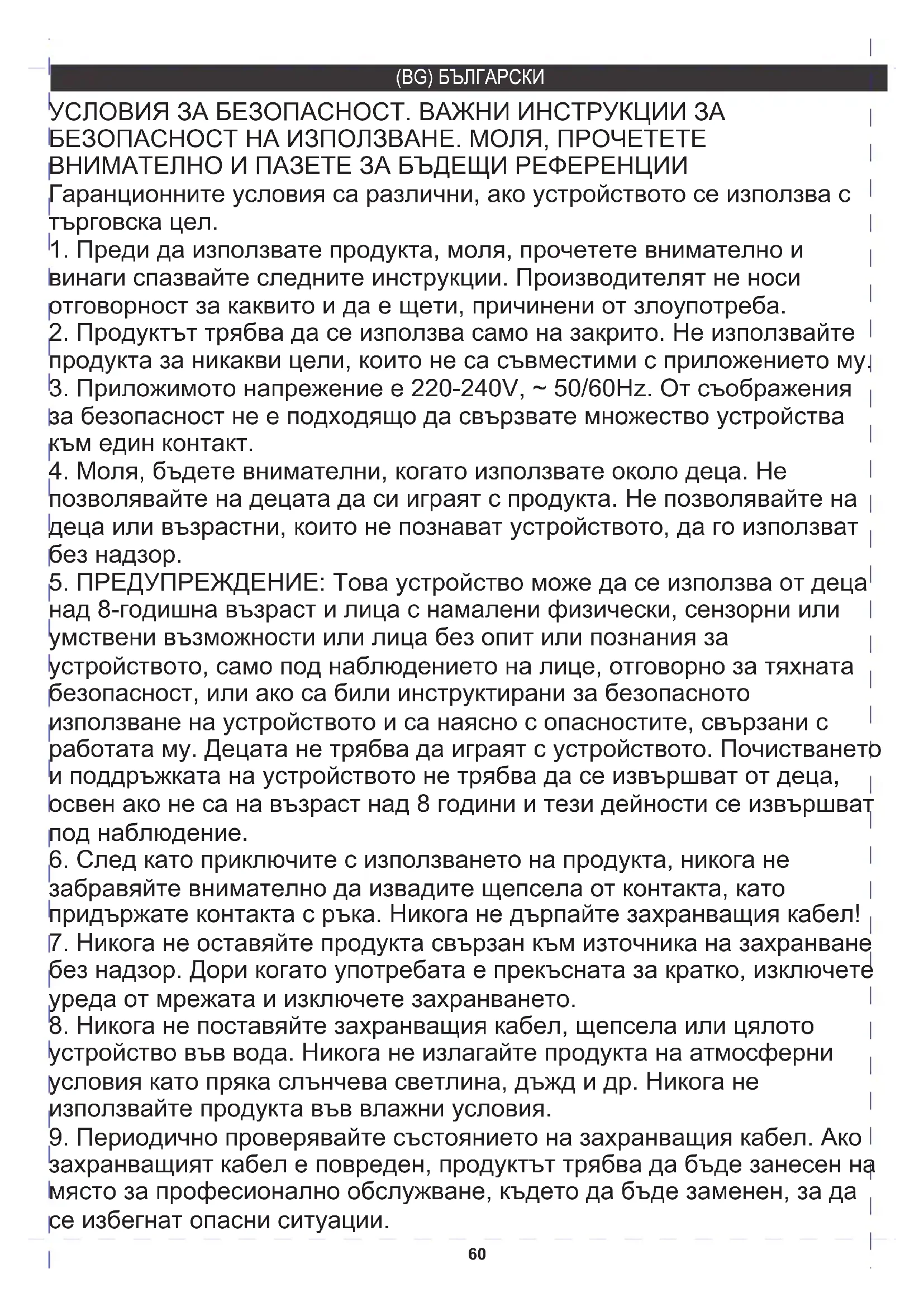 винаги спазвайте следните инструкции. Производителят не носи отговорност за каквито и да е щети, причинени от злоупотреба. Гаранционните условия са различни, ако устройството се използва с търговска цел. УСЛОВИЯ ЗА БЕЗОПАСНОСТ. ВАЖНИ ИНСТРУКЦИИ ЗА БЕЗОПАСНОСТ НА ИЗПОЛЗВАНЕ. МОЛЯ, ПРОЧЕТЕТЕ ВНИМАТЕЛНО И ПАЗЕТЕ ЗА БЪДЕЩИ РЕФЕРЕНЦИИ61