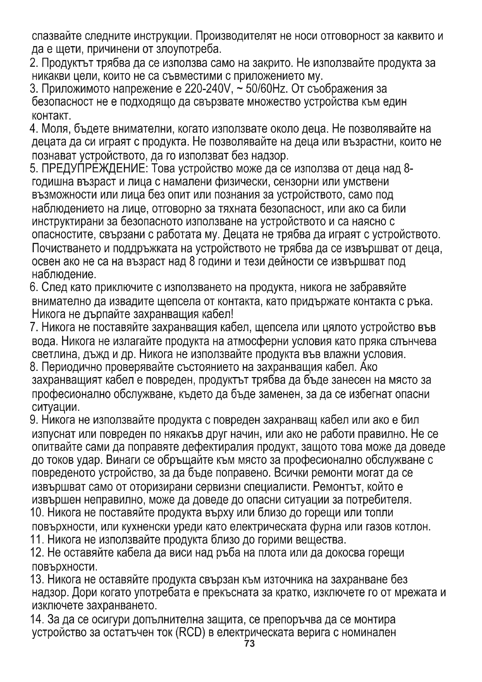 годишна възраст и лица с намалени физически, сензорни или умствени възможности или лица без опит или познания за устройството, само под наблюдението на лице, отговорно за тяхната безопасност, или ако са били инструктирани за безопасното използване на устройството и са наясно с опасностите, свързани с работата му. Децата не трябва да играят с устройството. Почистването и поддръжката на устройството не трябва да се извършват от деца, освен ако не са на възраст над 8 години и тези дейности се извършват под наблюдение.