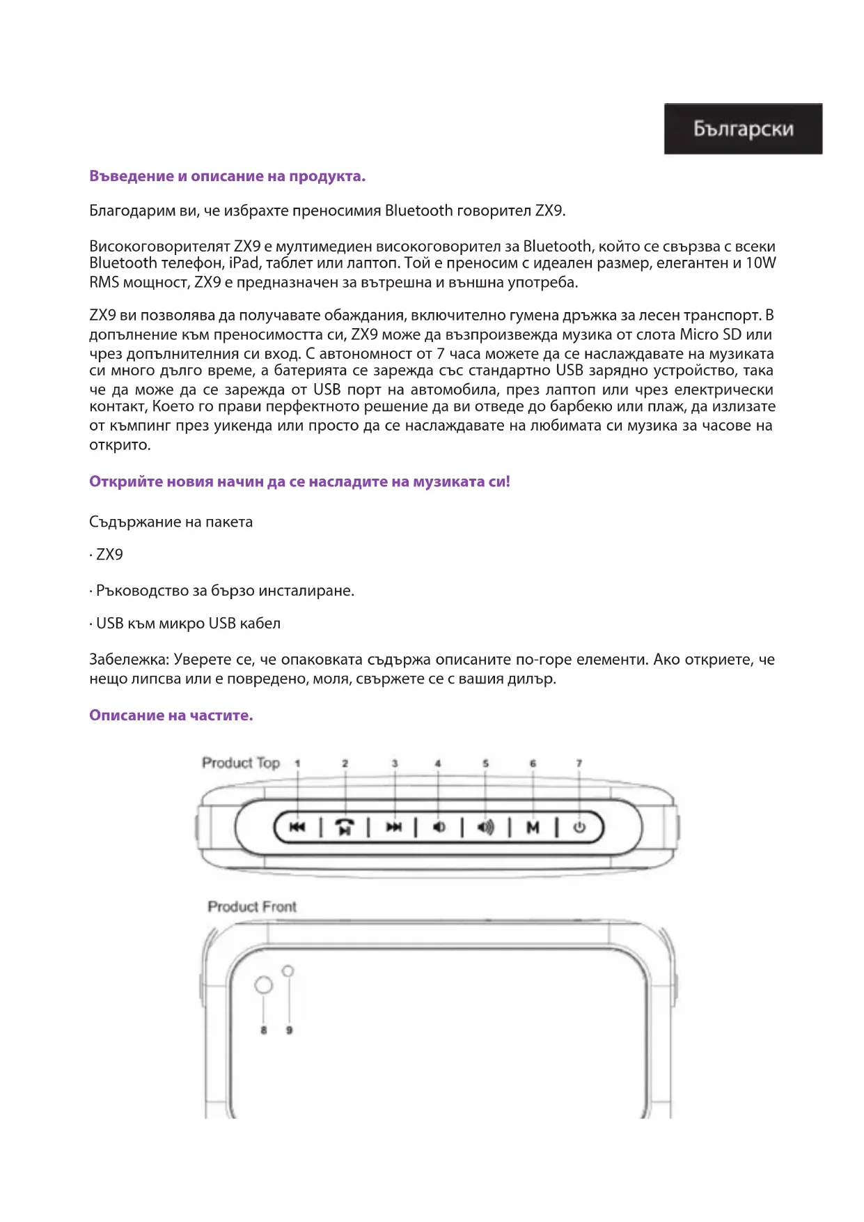 Въведение и описание на продукта. Благодарим ви, че избрахте преносимия Bluetooth говорител ZX9. Високоговорителят ZX9 е мултимедиен високоговорител за Bluetooth, който се свързва с всеки Bluetooth телефон, iPad, таблет или лаптоп. Той е преносим с идеален размер, елегантен и 10W RMS мощност, ZX9 е предназначен за вътрешна и външна употреба. ZX9 ви позволява да получавате обаждания, включително гумена дръжка за лесен транспорт. В допълнение към преносимостта си, ZX9 може да възпроизвежда музика от слота Micro SD или чрез допълнителния си вход. С автономност от 7 часа можете да се наслаждавате на музиката си много дълго време, а батерията се зарежда със стандартно USB зарядно устройство, така че да може да се зарежда от USB порт на автомобила, през лаптоп или чрез електрически контакт, Което го прави перфектното решение да ви отведе до барбекю или плаж, да излизате от къмпинг през уикенда или просто да се наслаждавате на любимата си музика за часове на