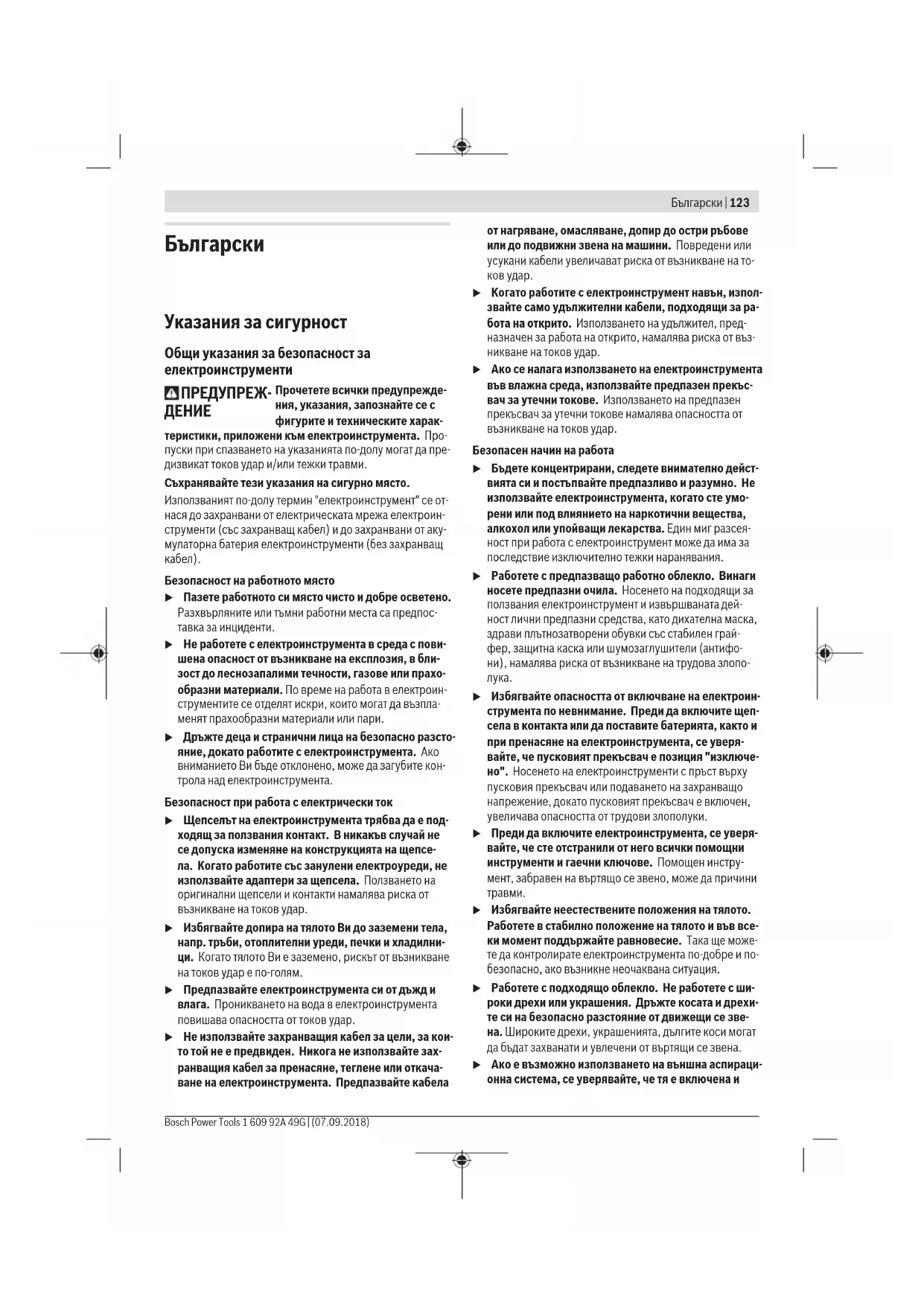 Прочетете всички предупрежде- ния, указания, запознайте се с фигурите и техническите харак- теристики, приложени към електроинструмента. Про- пуски при спазването на указанията по-долу могат да пре- дизвикат токов удар и/или тежки травми. Съхранявайте тези указания на сигурно място. Използваният по-долу термин "електроинструмент" се от- нася до захранвани от електрическата мрежа електроин- струменти (със захранващ кабел) и до захранвани от аку- мулаторна батерия електроинструменти (беззахранващ