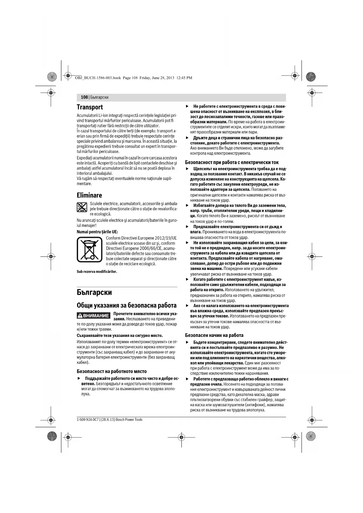 Пълна стойност на вибрациите Символ Значение OBJ_BUCH-1586-003.book Page 111 Friday, June 28, 2013 12:45 PM112 | Български 1 609 92A 0C7 | (28.6.13) Bosch Power Tools Декларация за съответствие С пълна отговорност ние декларираме, че описаният в раздела «технически данни» продукт съответства на изис- кванията на следните стандарти и нормативни документи: EN 60745 съгласно изискванията на директиви 2009/125/ЕО (Разпоредба 1194/2012), 2011/65/ЕС, 2004/108/ЕО, 2006/42/ЕО. Техническа документация (2006/42/ЕО) при: Robert Bosch GmbH, PT/ETM9, D-70745 Leinfelden-Echterdingen Robert Bosch GmbH, Power Tools Division D-70745 Leinfelden-Echterdingen