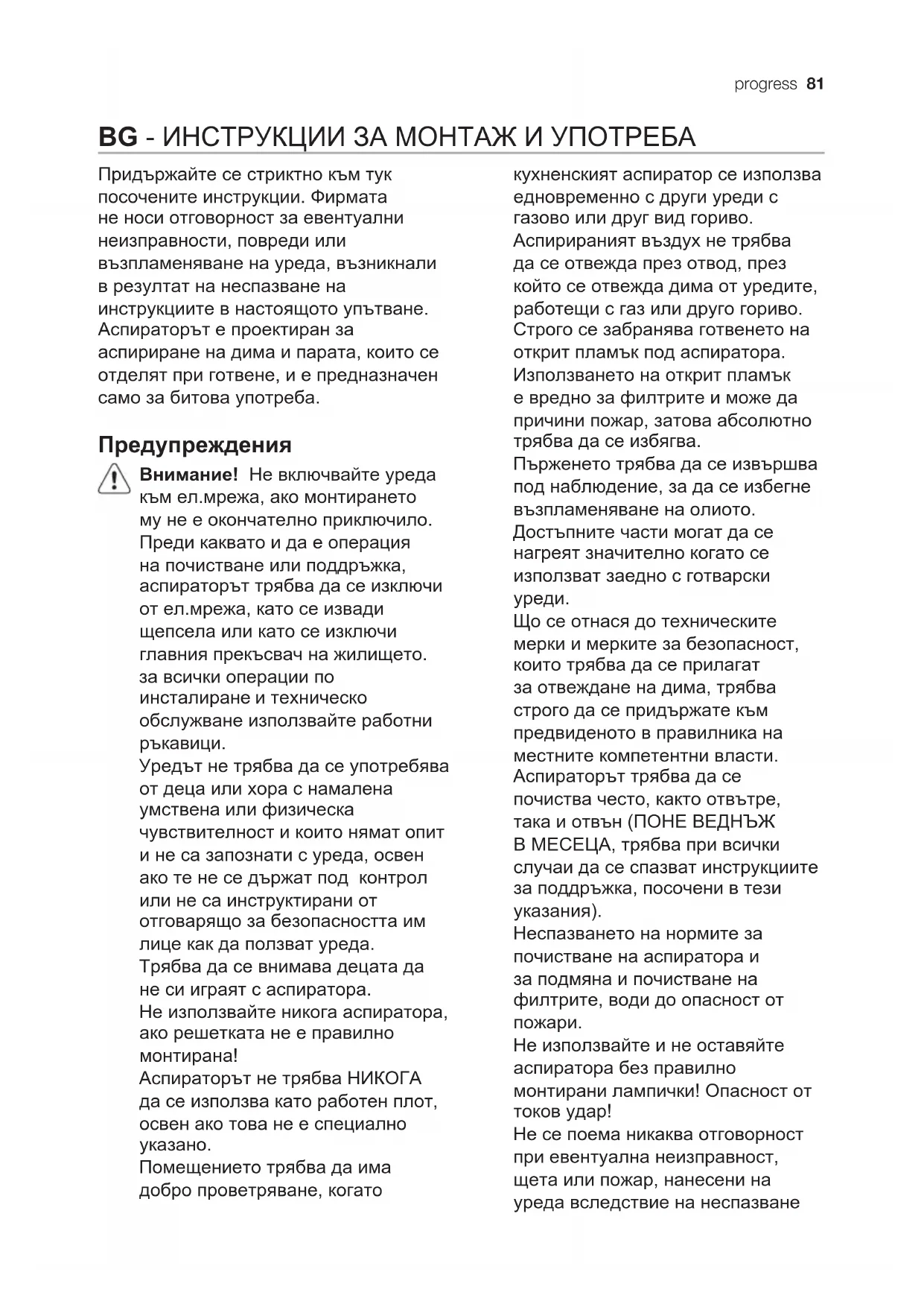 Не използвайте и не оставяйте аспиратора без правилно монтирани лампички! Опасност от токов удар! Не се поема никаква отговорност при евентуална неизправност, щета или пожар, нанесени на уреда вследствие на неспазване82 progress на настоящите инструкции. Този уред отговаря на изискванията на : - Европейската директива 2002/96/