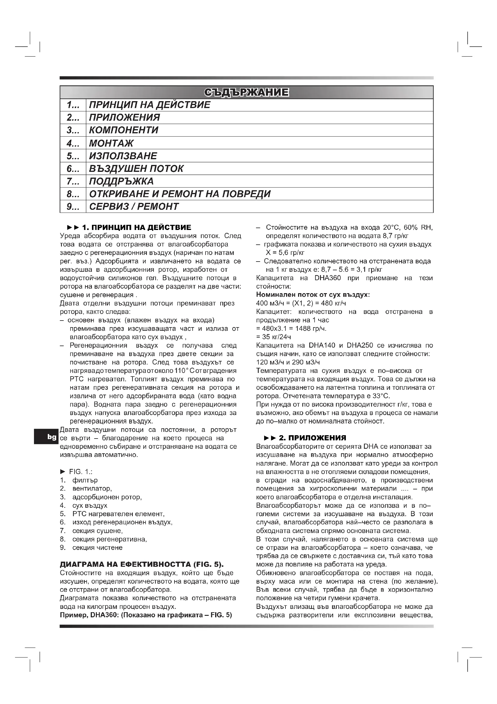 Потокът на регенерационен въздух трябва винаги да се контролира. Проверете маркуча за да се осигури свободен поток на регенерационния въздух. Проверете също дали тръбата за регенерационен въздух има отвеждане от влагоабсорбатора. В СЛУЧАЙ НА DHA360: ВКЛЮЧВАНЕ НА НАГРЕВАТЕЛИТЕ: И двата E1 и E2 нагреватели се включват при 10K4 като E1 се включва със закъснение от 30 секунди. Амперметърът ще отрази това както следва: – когато влагоабсорбатора е включен, амперметърът показва стойността 10А през около 5 сек, а след това се намалява стойността на 5А. – след 30 сек. се включва нагревател E1, и амперметърът показва стойност приблизително 18А през 5 сек., а след това стойността пада до 8,00 A при регулиран поток на регенеративен въздух. След коригиране на електрическите настройки и въздушния поток, влагоабсорбатора впоследствие се стартира автоматично с помощта на функциите на вътрешния контрол и безопасност, контролирани чрез външен хигростат. ► 7. ПОДДРЪЖКА Влагоабсорбаторите DHA изискват поддръжка само в ограничена степен. Никои от компоненти не се нуждаят от поддръжка, което означава, че не се изисква смазване или корекция. При нормална работа, проверявайте само три неща : – въздушният филтър трябва да се смени най– малко на всеки два месеца, в случай на фиксирана инсталация. Ако устройството се използва за даване под наем, нивото на праха в третирания въздух може да бъде високо. В този случай, филтърът трябва да се сменя с по–голяма честота. При смяна на филтъра трябва да почистите корпуса и ротора. – оборотите на ротора трябва да се проверяват веднъж месечно, – Често трябва да проверявате консумацията на енергия от електрическите нагреватели (четене на амперметър, с изключение на DHA140). Скоростта на ротора може да се контролира от изхода на сухия въздух, когато маркуча не е свързан. Роторът трябва да се върти в посока на часовниковата стрелка. Ако роторът се върти по време на работа и потреблението на енергия от електрическия нагревател показва номиналната текущата стойност, можете да бъдете сигурни, че влагоабсорбатора функционира по оптимален начин. Въпреки това, ние препоръчваме периодична проверка на целия влагоабсорбатор, за да проверите дали всички вътрешни функции работят правилно. Също така препоръчваме проверка на уплътненията и движещи се части от гледна точна на