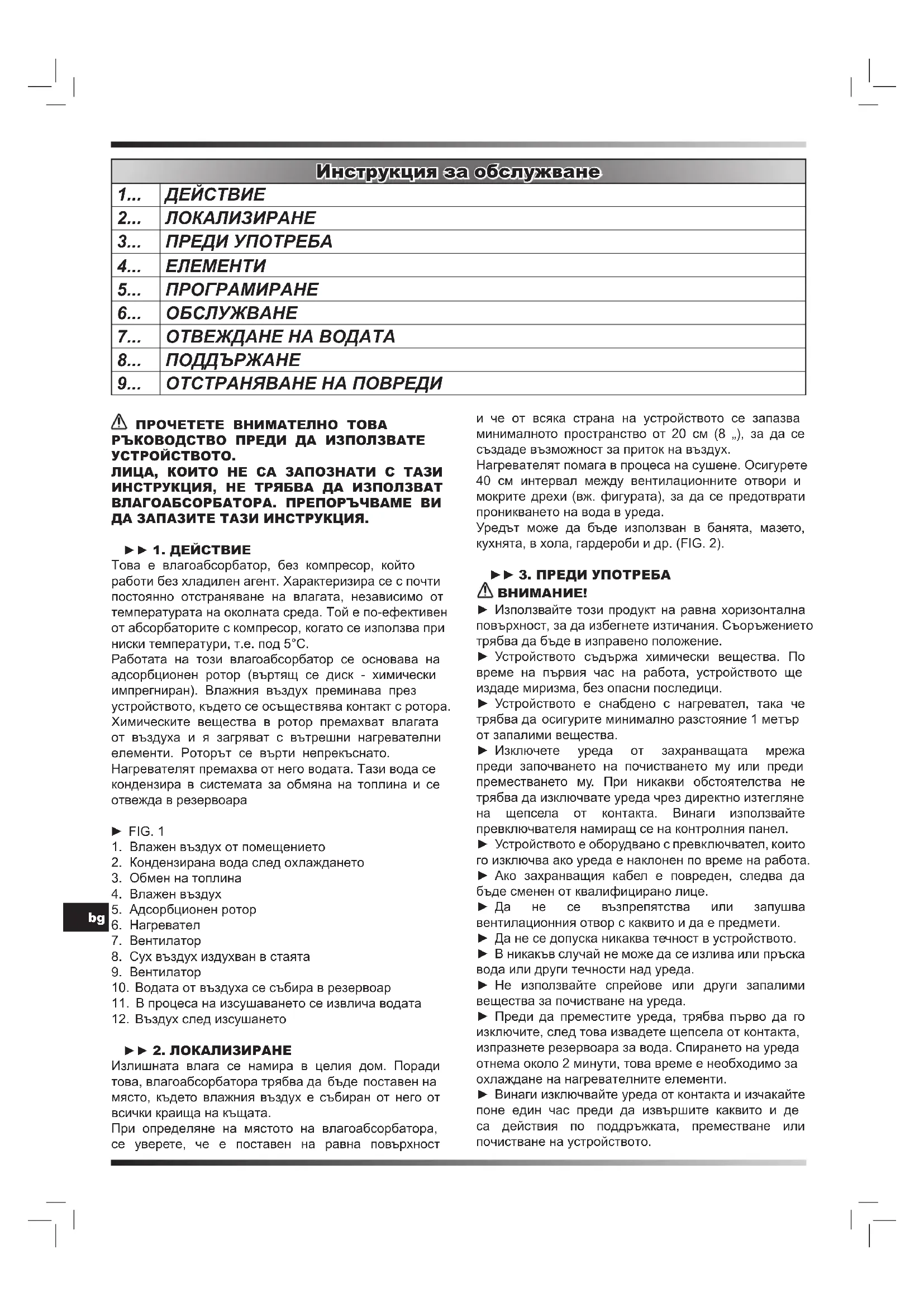 UKПРОЧЕТЕТЕ ВНИМАТЕЛНО ТОВА РЪКОВОДСТВО ПРЕДИ ДА ИЗПОЛЗВАТЕ УСТРОЙСТВОТО. ЛИЦА, КОИТО НЕ СА ЗАПОЗНАТИ С ТАЗИ ИНСТРУКЦИЯ, НЕ ТРЯБВА ДА ИЗПОЛЗВАТ ВЛАГОАБСОРБАТОРА. ПРЕПОРЪЧВАМЕ ВИ ДА ЗАПАЗИТЕ ТАЗИ ИНСТРУКЦИЯ. ► 1. ДЕЙСТВИЕ Това е влагоабсорбатор, без компресор, който работи без хладилен агент. Характеризира се с почти постоянно отстраняване на влагата, независимо от температурата на околната среда. Той е по-ефективен от абсорбаторите с компресор, когато се използва при ниски температури, т.е. под 5°C. Работата на този влагоабсорбатор се основава на адсорбционен ротор (въртящ се диск - химически импрегниран). Влажния въздух преминава през устройството, където се осъществява контакт с ротора. Химическите вещества в ротор премахват влагата от въздуха и я загряват с вътрешни нагревателни елементи. Роторът се върти непрекъснато. Нагревателят премахва от него водата. Тази вода се кондензира в системата за обмяна на топлина и се отвежда в резервоара ► FIG. 1