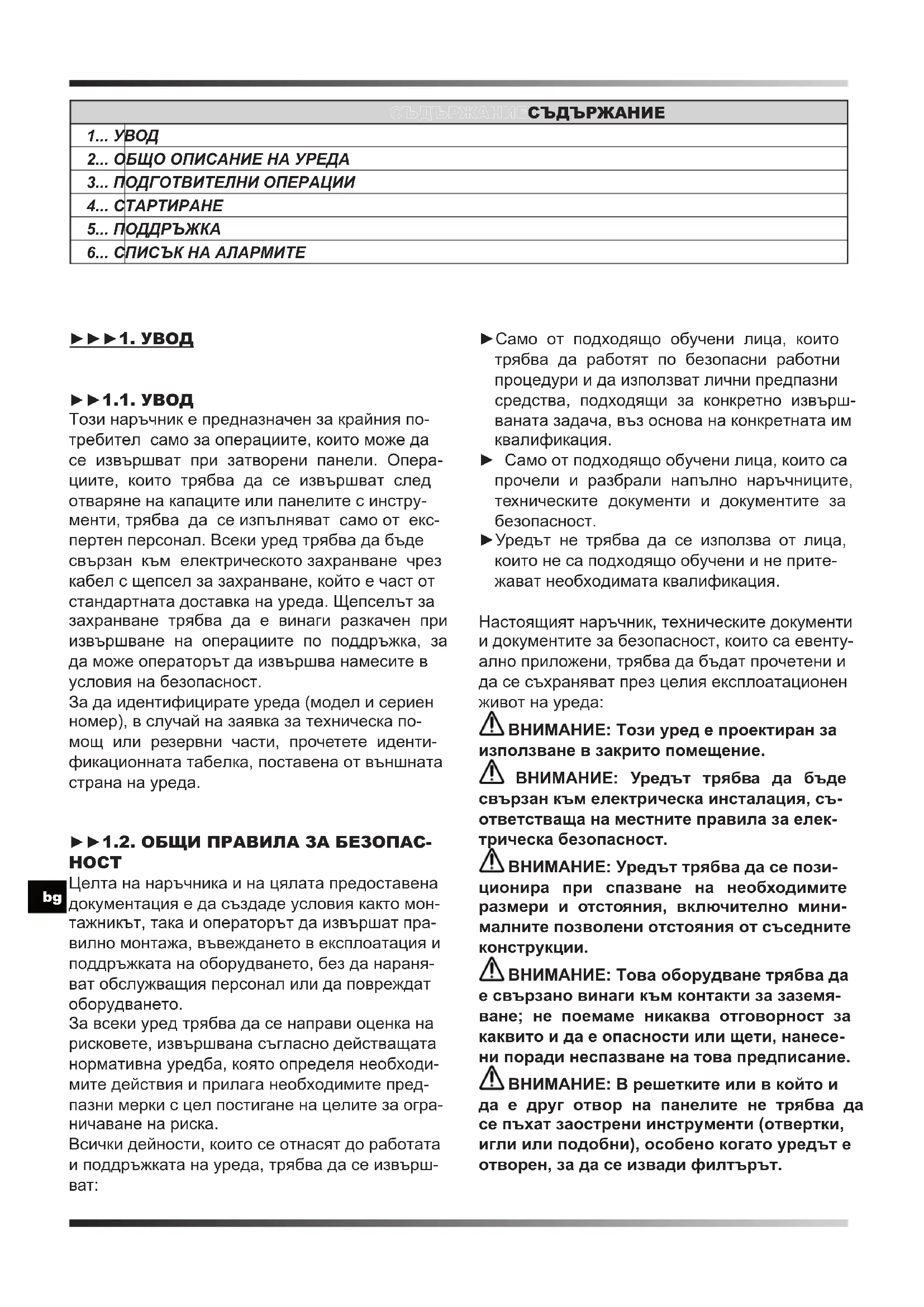 СЪДЪРЖАНИЕСЪДЪРЖАНИЕ 1... УВОД 2... ОБЩО ОПИСАНИЕ НА УРЕДА 3... ПОДГОТВИТЕЛНИ ОПЕРАЦИИ 4... СТАРТИРАНЕ 5... ПОДДРЪЖКА 6... СПИСЪК НА АЛАРМИТЕ ►►►1. УВОД ►►1.1. УВОД Този наръчник е предназначен за крайния по- требител само за операциите, които може да се извършват при затворени панели. Опера- циите, които трябва да се извършват след отваряне на капаците или панелите с инстру- менти, трябва да се изпълняват само от екс- пертен персонал. Всеки уред трябва да бъде свързан към електрическото захранване чрез кабел с щепсел за захранване, който е част от стандартната доставка на уреда. Щепселът за захранване трябва да е винаги разкачен при извършване на операциите по поддръжка, за да може операторът да извършва намесите в условия на безопасност. За да идентифицирате уреда (модел и сериен номер), в случай на заявка за техническа по- мощ или резервни части, прочетете иденти- фикационната табелка, поставена от външната страна на уреда. ►►1.2. ОБЩИ ПРАВИЛА ЗА БЕЗОПАС-