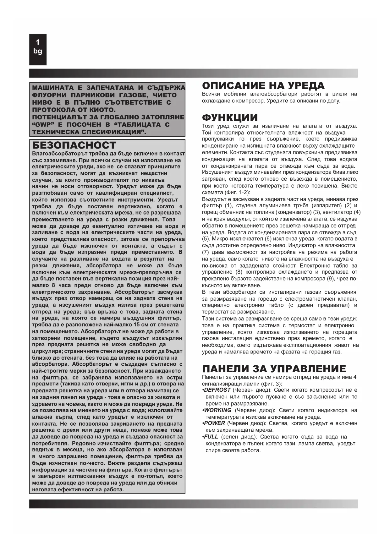 Този уред служи за извличане на влагата от въздуха. Той контролира относителната влажност на въздуха пропускайки го през съоръжение, което предизвиква кондензиране на излишната влажност върху охлаждащите елементи. Контакта със студената повърхнина предизвиква кондензация на влагата от въздуха. След това водата от кондензираната пара се отвежда към съда за вода. Изсушеният въздух минавайки през кондензатора бива леко загряван, след което отново се въвежда в помещението, при което неговата температура е леко повишена. Вижте схемата (Фиг. 1-2): Въздухът е засмукван в задната част на уреда, минава през филтър (1), студена алуминиева тръба (изпарител) (2) и горещ обменник на топлина (кондензатор) (3), вентилатор (4) и на края въздухът, от който е извлечена влагата, се издухва обратно в помещението през решетка намираща се отпред на уреда. Водата от кондензираната пара се отвежда в съд (5). Микро-изключвател (6) изключва уреда, когато водата в съда достигне определено ниво. Индикатор на влажността (7) дава възможност за настройка на режима на работа на уреда, само когато нивото на влажността на въздуха е по-висока от зададената стойност. Електронно табло за управление (8) контролира охлаждането и предпазва от прекалено бързото задействане на компресора (9), чрез по- късното му включване. В тези абсорбатори са инсталирани газови съоръжения за размразяване на горещо с електромагнетичен клапан, специално електронно табло (с двоен предавател) и термостат за размразяване. Тази система за размразяване се среща само в тези уреди: това е на практика система с термостат и електронно управление, която използва използването на горещата газова инсталация единствено през времето, когато е необходима, което издължава експлоатационния живот на уреда и намалява времето на фазата на горещия газ. ПАНЕЛИ ЗА УПРАВЛЕНИЕ Панелът за управление се намира отпред на уреда и има 4 сигнализиращи лампи (фиг. 3):