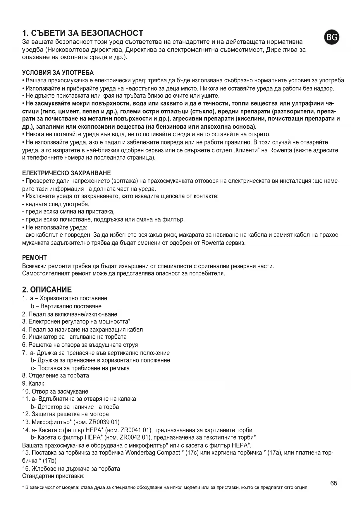 - Не използвайте уреда, ако е падал и забележите повреда или не работи правилно. В този случай не отваряйте уреда, а го изпратете в най-близкия одобрен сервиз или се свържете с отдел „Клиенти“ на Rowenta (вижте адресите и телефонните номера на последната страница). ЕЛЕКТРИЧЕСКО ЗАХРАНВАНЕ