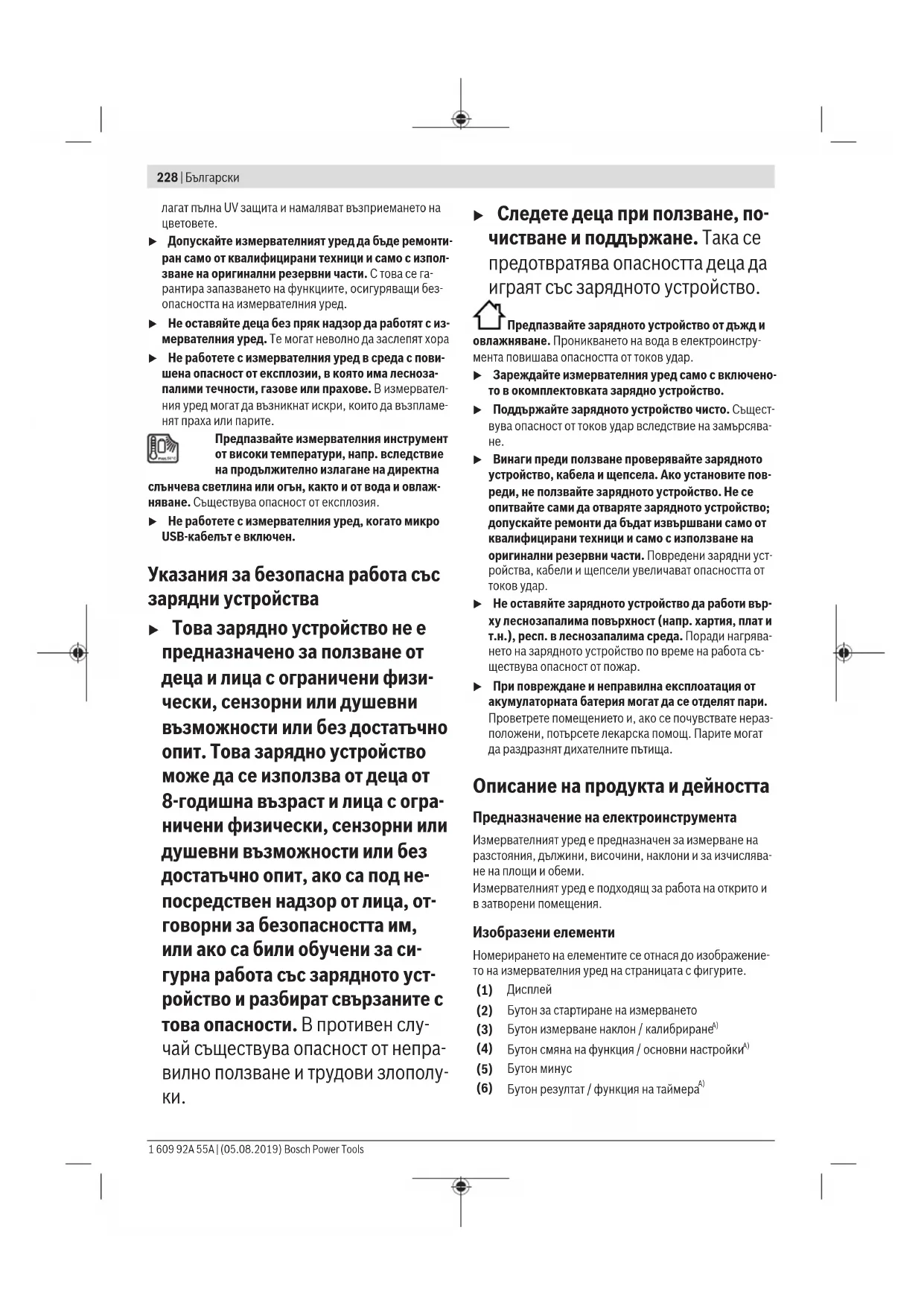 u Допускайте измервателният уред да бъде ремонти- ран само от квалифицирани техници и само с изпол- зване на оригинални резервни части. С това се га- рантира запазването на функциите, осигуряващи без- опасността на измервателния уред. u Не оставяйте деца без пряк надзор да работят с из- мервателния уред. Те могат неволно да заслепят хора u Не работете с измервателния уред в среда с пови- шена опасност от експлозии, в която има лесноза- палими течности, газове или прахове. В измервател- ния уред могат да възникнат искри, които да възпламе- нят праха или парите. Предпазвайте измервателния инструмент от високи температури, напр. вследствие на продължително излагане на директна слънчева светлина или огън, както и от вода и овлаж- няване. Съществува опасност от експлозия. u Не работете с измервателния уред, когато микро USB-кабелът е включен. Указания за безопасна работа със зарядни устройства u Това зарядно устройство не е предназначено за ползване от деца и лица с ограничени физи- чески, сензорни или душевни възможности или без достатъчно опит. Това зарядно устройство може да се използва от деца от 8-годишна възраст и лица с огра- ничени физически, сензорни или душевни възможности или без достатъчно опит, ако са под не- посредствен надзор от лица, от- говорни за безопасността им, или ако са били обучени за си- гурна работа със зарядното уст- ройство и разбират свързаните с това опасности. В противен слу- чай съществува опасност от непра- вилно ползване и трудови злополу-