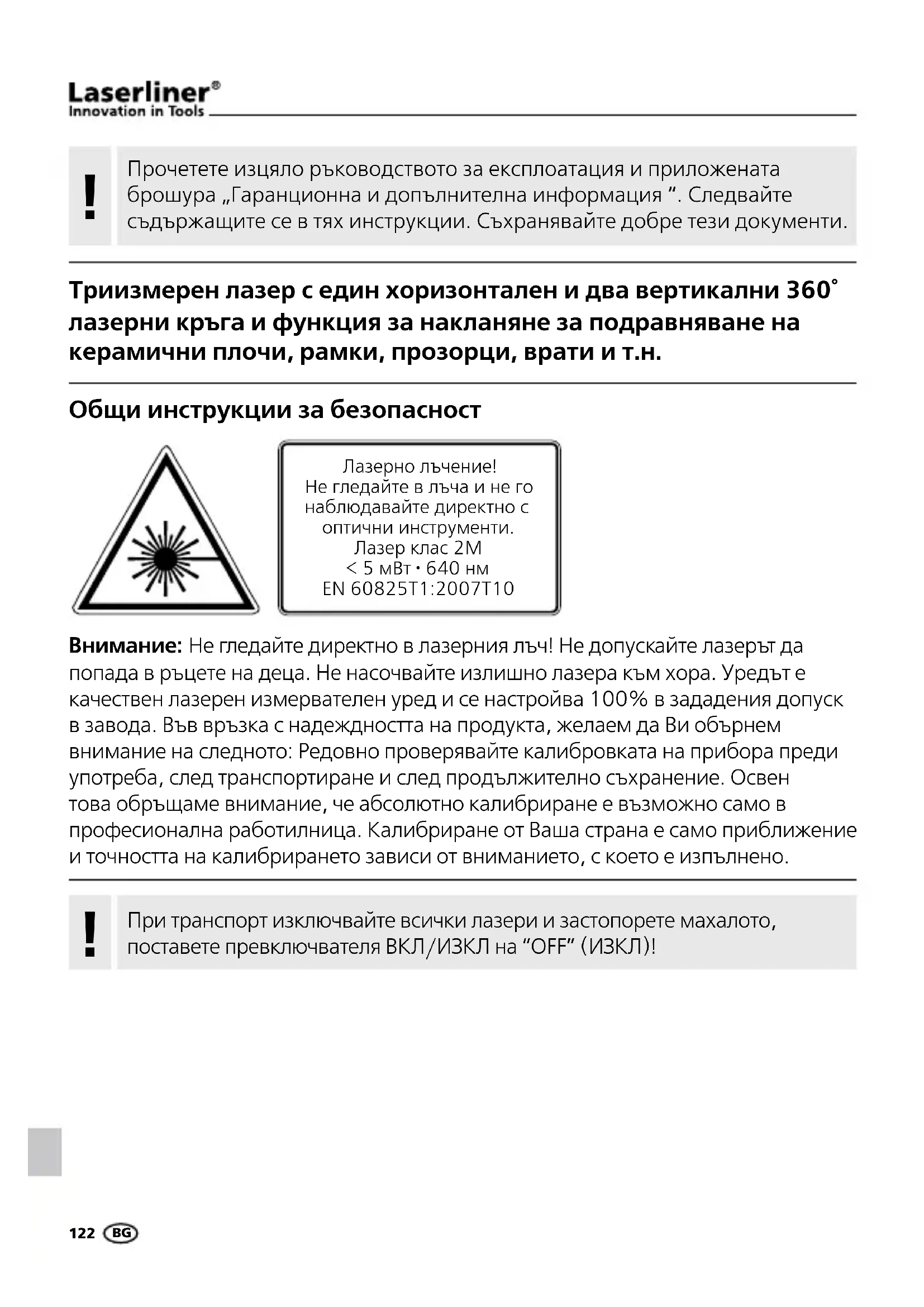 Общи инструкции за безопасност Внимание: Не гледайте директно в лазерния лъч! Не допускайте лазерът да попада в ръцете на деца. Не насочвайте излишно лазера към хора. Уредът е качествен лазерен измервателен уред и се настройва 100% в зададения допуск в завода. Във връзка с надеждността на продукта, желаем да Ви обърнем внимание на следното: Редовно проверявайте калибровката на прибора преди употреба, след транспортиране и след продължително съхранение. Освен това обръщаме внимание, че абсолютно калибриране е възможно само в професионална работилница. Калибриране от Ваша страна е само приближение и точността на калибрирането зависи от вниманието, с което е изпълнено. Лазерно лъчение! Не гледайте в лъча и не го наблюдавайте директно с оптични инструменти. Лазер клас 2M < 5 мВт · 640 нм EN 60825T1:2007T10 При транспорт изключвайте всички лазери и застопорете махалото, поставете превключвателя ВКЛ/ИЗКЛ на “OFF” (ИЗКЛ)!