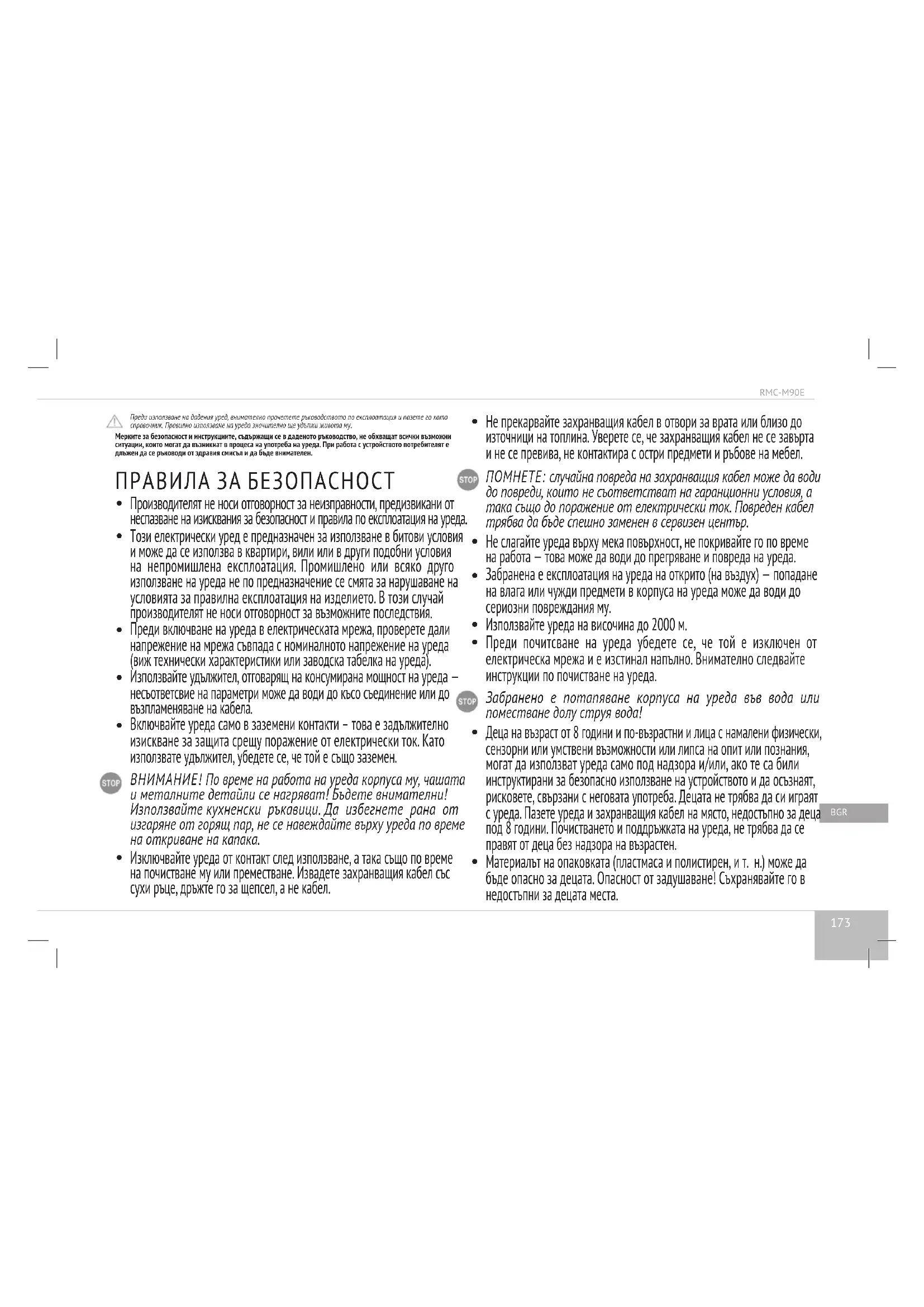 Капакът не е плътно за- творен или под него е попаднал чужд предмет. Проверете да не би между капака и корпуса на уреда да има попаднали чужди предмети (боклук, зърна, късчета храна). Ако има такива, отстранете ги. Винаги затваряйте капака на уреда до щракване. Уплътнителната гума на вътрешния капак е много замърсена, деформирана или повредена. Проверете състоянието на уплътнителната гума върху вътрешния капак на уреда. Може би тя трябва да бъде сменена. В случай, че неизправността не може да се отстрани, обърнете се към авторизирания сервизен център. Екологично безвредна утилизация (утилизация на електрическо и електронно оборудване) Изхвърлянето на опаковката, ръководствата, както и самият уред трябва да се извърши в съответствие с местните програми за рециклиране. Проявете загриженост за околната среда и не изхвърляйте тези продукти с обикновените битови отпадъци. Използваните (стари) уреди не трябва да се изхвърлят с другите битови отпадъци, те трябва да се утилизират отделно. Собствениците на старо оборудване трябва да отнесат уредите в специалните пунктове за събиране на такива отпадъци или да ги предадат в съответните организации. Така ще подпомогнете програмата за преработка на ценни суровини, както и за пречистване на замърсяващи вещества. Даденият прибор е произведен в съответствие с Европейските директиви 2012/19/ EU, регулиращи използването на електрически електронни уреди. Дадената директива определя основните изисквания за използване ипреработка на отпадъците от електрическите електронни прибори, действащи на територията на целия Европейски Съюз.181 RMC-M90E GBR FRA DEU ITA ESP PRT DNK NOR SWE FIN ROU HUN BGR HRV CZE SVK SVN POL LT U LVA EST SRB GRC RUS UKR Прежде чем использовать данное устройство, внимательно прочитайте руководство по эксплуатации и сохраните в качестве справочника. Правильное использование прибора значительно продлит срок его службы. Меры безопасности и инструкции, содержащиеся в данном руководстве, не охватывают все возможные ситуации, которые могут возникнуть в процессе эксплуатации прибора. При работе с устройством пользователь должен руко- водствоваться здравым смыслом, быть осторожным и внимательным. МЕРЫ БЕЗОПАСНОСТИ