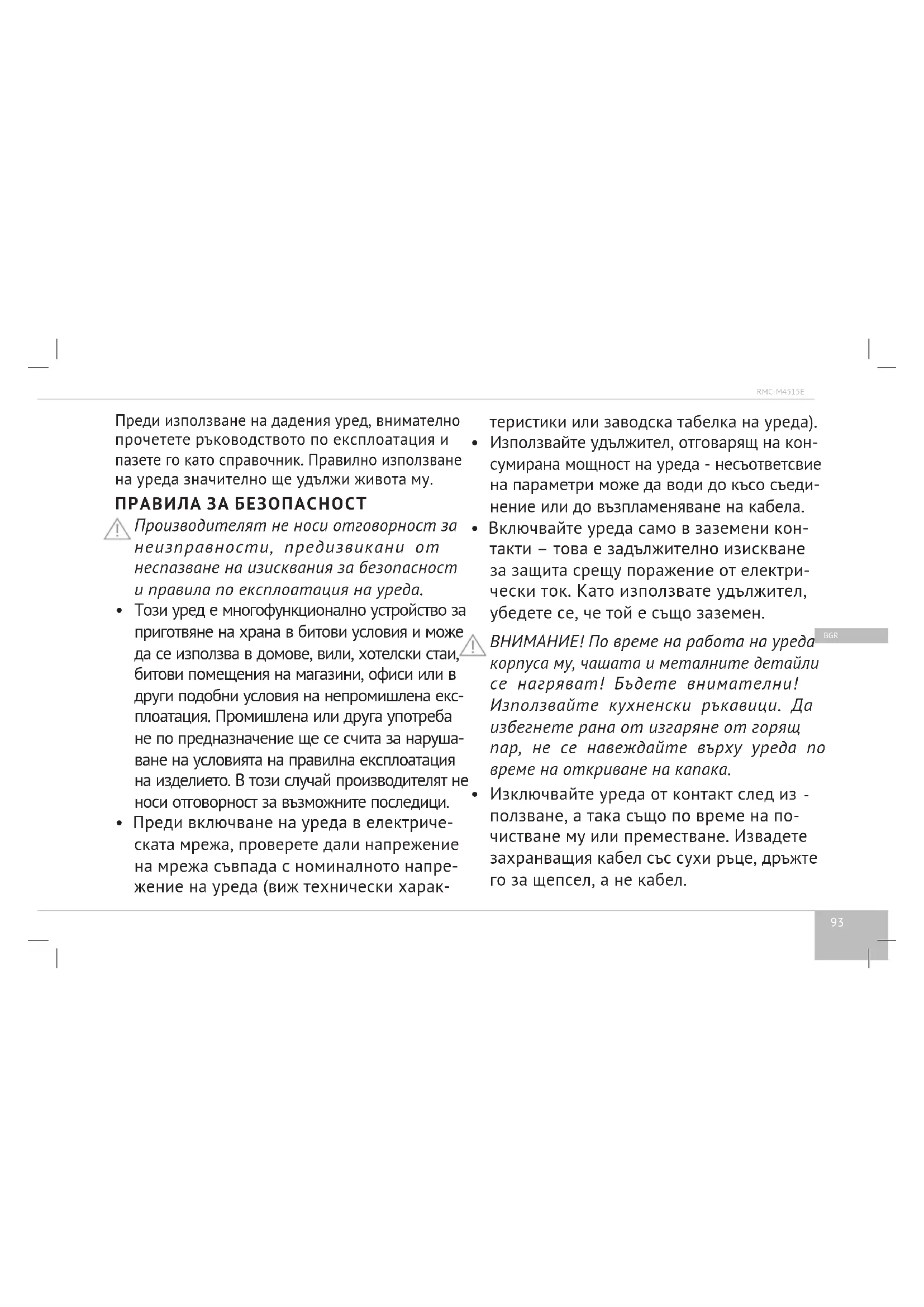 На дадено изделие предоставя се гаранционен срок 2 години от датата на закупуване. По време на гаранционен период производител е задължен да отстранява с ремонт, замяна на части или замяна на цялото изделие вся- какви заводски дефекти, предизвикани от недостатъчно качество на материали или сглобяване. Гаранцията влиза в силата само в тоза случай, кога дата на закупуване е потвърдена с печат на магазина и подписа на продавач върху оригинала на гаранционен лист. Дадена гаранция е валидна само ако изделие беше използвано в съответствие с инструкция по експлоатация, не беше ремонтирано, разглобено и повреждано като резултат на неправилно боравене, а така също е пазена пълна комплектност на изделието. Дадена гаранция не е валидна за нормално износване на изделие и консумативи (филтри, лампи, керамични и тефлонови покрития, уплътни- тели и т.н.). Срокът на службата на изделието и срокът на действието на гарантийните задължения се изброяват от деня на продажбата или от датата на изработването на изделието (в случая, ако датата на продажбата не може да се определи). Датата на изготвянето на прибора може да се намери в серийния номер, разположен на идентификационния етикет върху корпуса на изделието. Серийният номер се състои от 13 знака. 6-ият и 7-ият знакове обозначават месеца, 8-ият – годината на произвеждането на уреда. Установен от производителя животът на уреда е 5 години от датата на закупуване го, при условие, че изделието се експлоатира в съответствие с дадена инструкция и приложими технически стандарти. Опаковката, ръководството на потребителя, а така също и самият уред трябва да се утилизират с съот- ветствие с местната програма по рециклиране на отпадъци. Не изхвърляйте такива изделия заедно с обик- новени битови отпадъци.99 HRV RMC-M4515E Prije nego što počnete da koristite ovaj uređaj, pažljivo pročitajte upute za njegovo korištenje i spremite ih kao priručnik. Pravilno korištenje uređaja znatno će produžiti njegov rok trajanja.