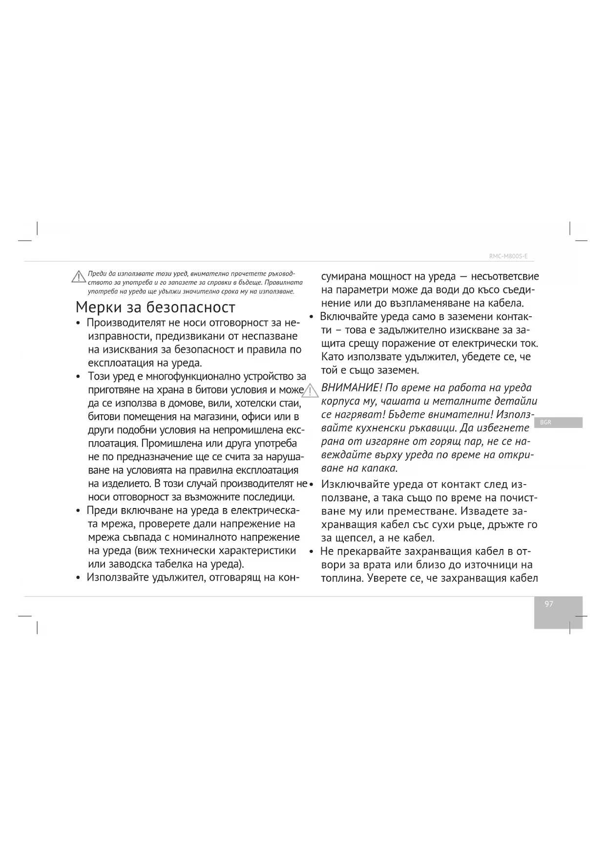 - Включвайте уреда само в заземени контак- ти – това е задължително изискване за за- щита срещу поражение от електрически ток. Като използвате удължител, убедете се, че той е също заземен. ВНИМАНИЕ! По време на работа на уреда корпуса му, чашата и металните детайли се нагряват! Бъдете внимателни! Използ- вайте кухненски ръкавици. Да избегнете рана от изгаряне от горящ пар, не се на- веждайте върху уреда по време на откри- ване на капака.