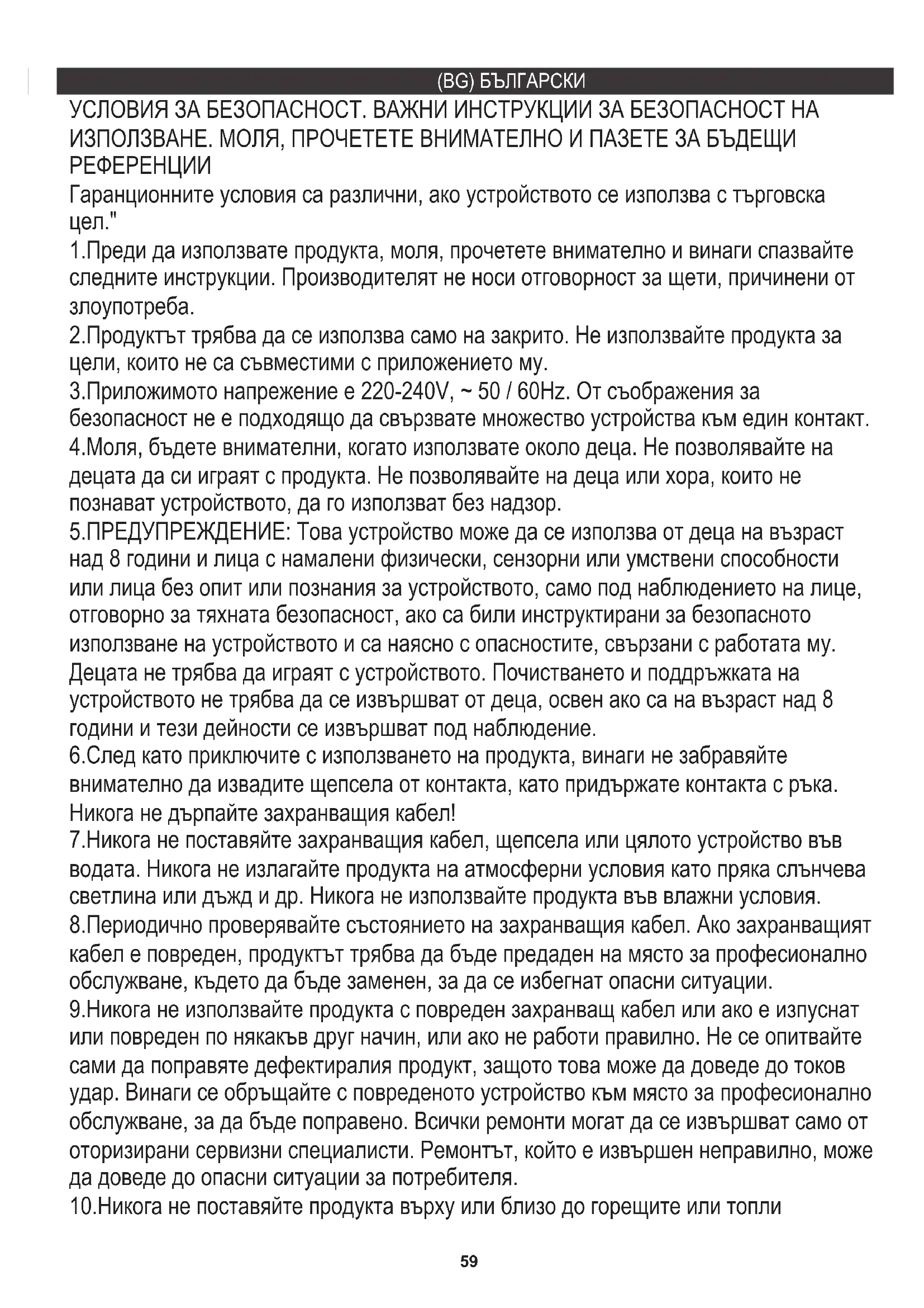 ﺪﯾﺪﮭﺗ تﺎﻧﻮﻜﻤﻟا ﻞﻜﺸﺗ ﺪﻗ زﺎﮭﺠﻟا ﻲﻓ تﺎﯾرﺎﻄﺑ كﺎﻨھ نﺎﻛ اذإ .ﺎﮭﻣاﺪﺨﺘﺳاو ﺎﮭﻣاﺪﺨﺘﺳا ةدﺎﻋإ ،.ﻞﺼﻔﻨﻣ ﻞﻜﺸﺑ ﺔﻧﺰﺨﻤﻟا ﺔﻄﻘﻨﻟا ﻰﻟإ ﺎﮭﺋﺎﻄﻋإو ﺎﮭﺟاﺮﺧإ ﻚﯿﻠﻌﻓ59 10.Никога не поставяйте продукта върху или близо до горещите или топли 9.Никога не използвайте продукта с повреден захранващ кабел или ако е изпуснат или повреден по някакъв друг начин, или ако не работи правилно. Не се опитвайте сами да поправяте дефектиралия продукт, защото това може да доведе до токов удар. Винаги се обръщайте с повреденото устройство към място за професионално обслужване, за да бъде поправено. Всички ремонти могат да се извършват само от оторизирани сервизни специалисти. Ремонтът, който е извършен неправилно, може да доведе до опасни ситуации за потребителя. 1.Преди да използвате продукта, моля, прочетете внимателно и винаги спазвайте следните инструкции. Производителят не носи отговорност за щети, причинени от злоупотреба. 4.Моля, бъдете внимателни, когато използвате около деца. Не позволявайте на децата да си играят с продукта. Не позволявайте на деца или хора, които не познават устройството, да го използват без надзор. 5.ПРЕДУПРЕЖДЕНИЕ: Това устройство може да се използва от деца на възраст над 8 години и лица с намалени физически, сензорни или умствени способности или лица без опит или познания за устройството, само под наблюдението на лице, отговорно за тяхната безопасност, ако са били инструктирани за безопасното използване на устройството и са наясно с опасностите, свързани с работата му. Децата не трябва да играят с устройството. Почистването и поддръжката на устройството не трябва да се извършват от деца, освен ако са на възраст над 8 години и тези дейности се извършват под наблюдение. 8.Периодично проверявайте състоянието на захранващия кабел. Ако захранващият кабел е повреден, продуктът трябва да бъде предаден на място за професионално обслужване, където да бъде заменен, за да се избегнат опасни ситуации. 2.Продуктът трябва да се използва само на закрито. Не използвайте продукта за цели, които не са съвместими с приложението му. 6.След като приключите с използването на продукта, винаги не забравяйте внимателно да извадите щепсела от контакта, като придържате контакта с ръка. Никога не дърпайте захранващия кабел! 7.Никога не поставяйте захранващия кабел, щепсела или цялото устройство във водата. Никога не излагайте продукта на атмосферни условия като пряка слънчева светлина или дъжд и др. Никога не използвайте продукта във влажни условия. УСЛОВИЯ ЗА БЕЗОПАСНОСТ. ВАЖНИ ИНСТРУКЦИИ ЗА БЕЗОПАСНОСТ НА ИЗПОЛЗВАНЕ. МОЛЯ, ПРОЧЕТЕТЕ ВНИМАТЕЛНО И ПАЗЕТЕ ЗА БЪДЕЩИ