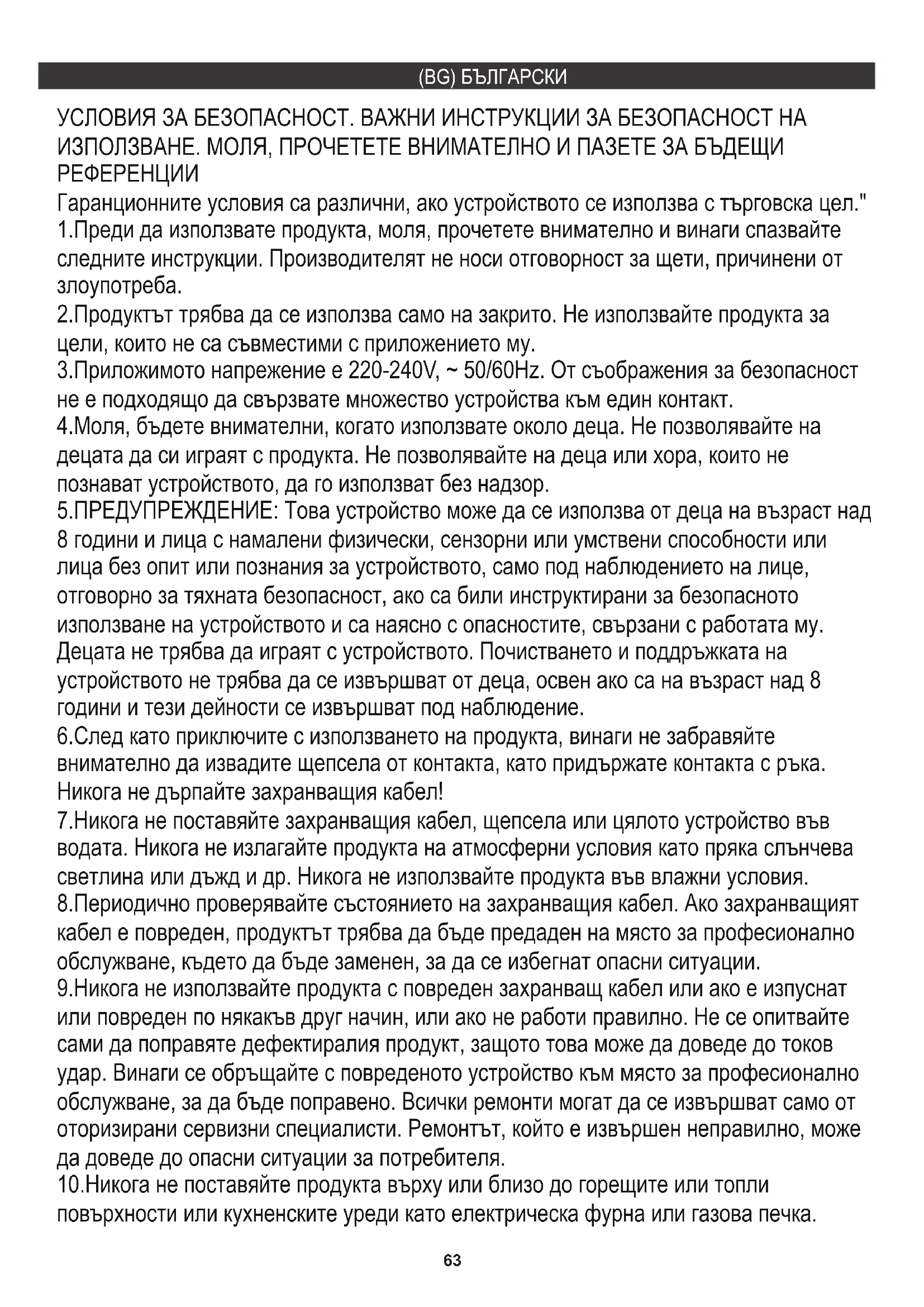 6.Àpres chaque utilisation, débrancher la fiche d'alimentation de la prise de courant, en Maintenant la prise avec la main. Ne pas tirer sur le cordon d'alimentation. - Ne pas tremper le cordon, la fiche ou l'appareil entier dans l'eau ou dans tout autre liquide. Ne pas exposer l'appareil à des conditions atmosphériques (plue, soleil etc.). Ne pas l'utiliser non plus dans des conditions d'humidité elevée (salle de bain, mobile-homes humides).